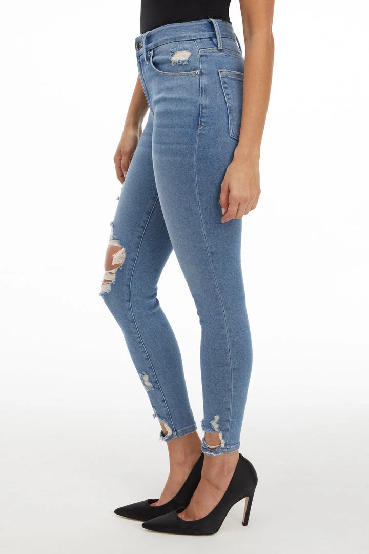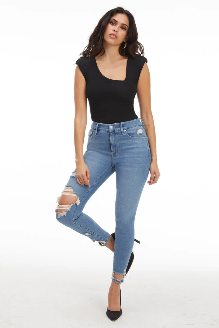 Our ultimate high rise waist-shaper, the Good Waist Crop in a medium blue wash. This classic jean is updated with a knee blowout and blown out hems.