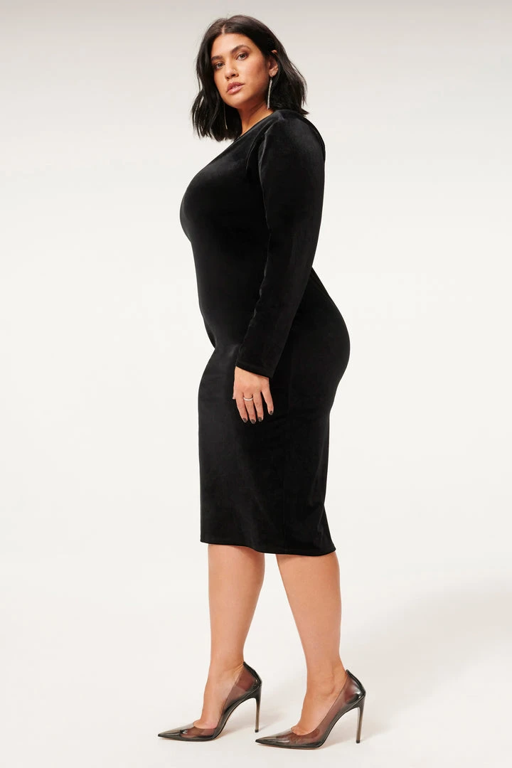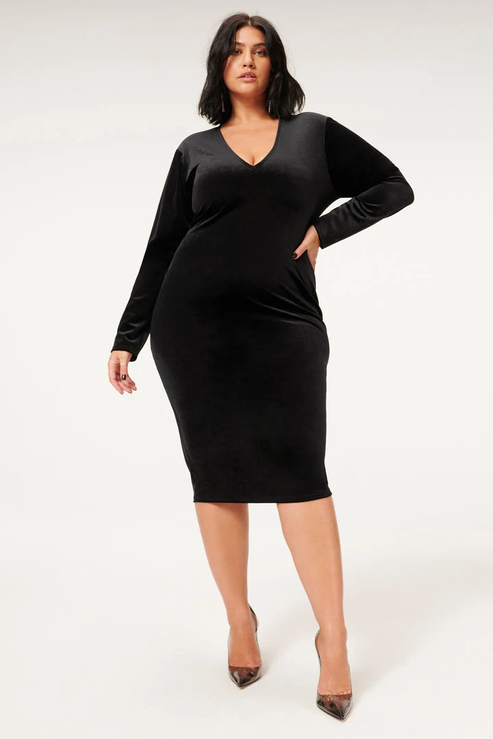 Step out in va-va-velvet glam wearing a curve-skimming dress styled to stun with a deeply dipped neckline.