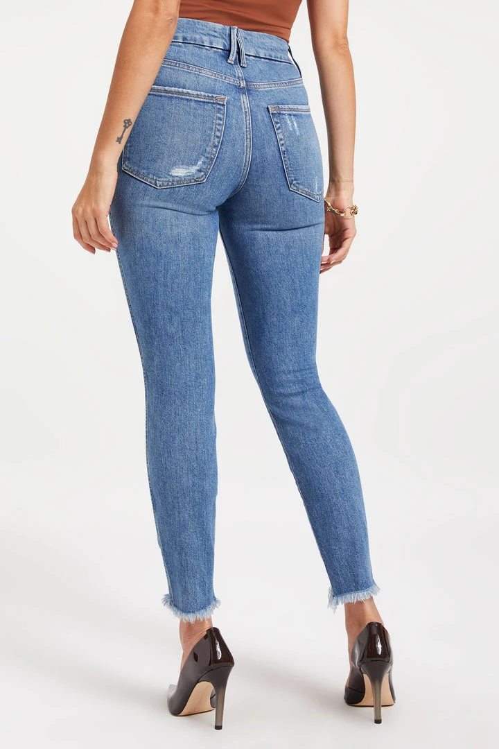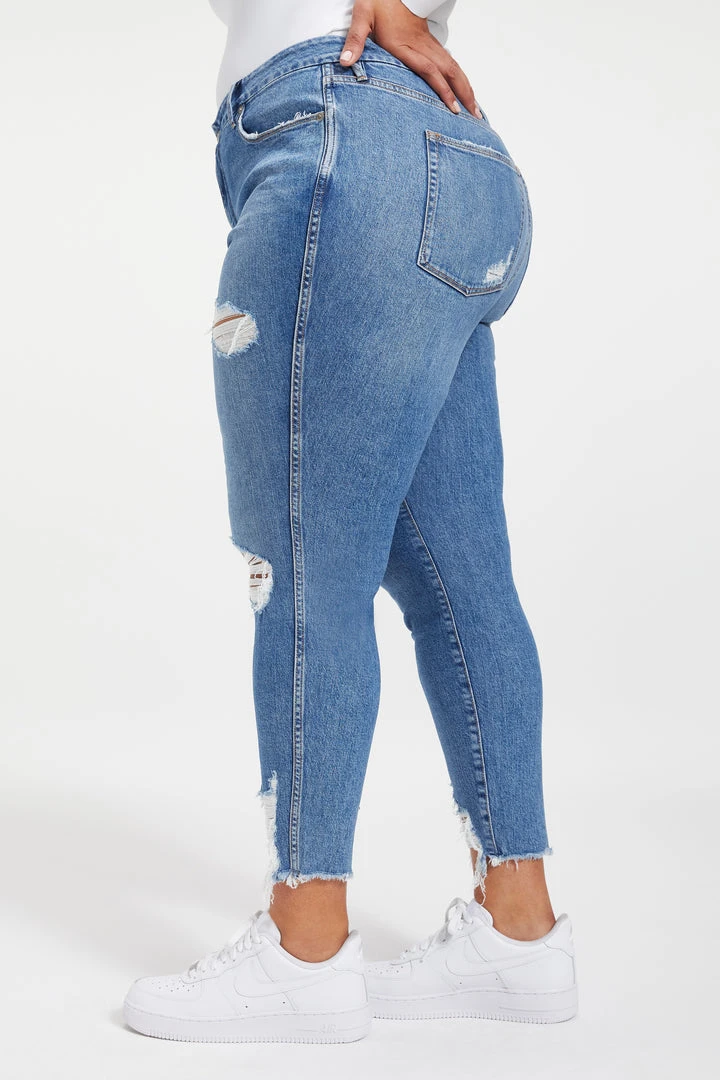 Corset-contouring elasticity on a classic skinny leg jean, the Good Curve Skinny Crop has distressed details and chewed hems.