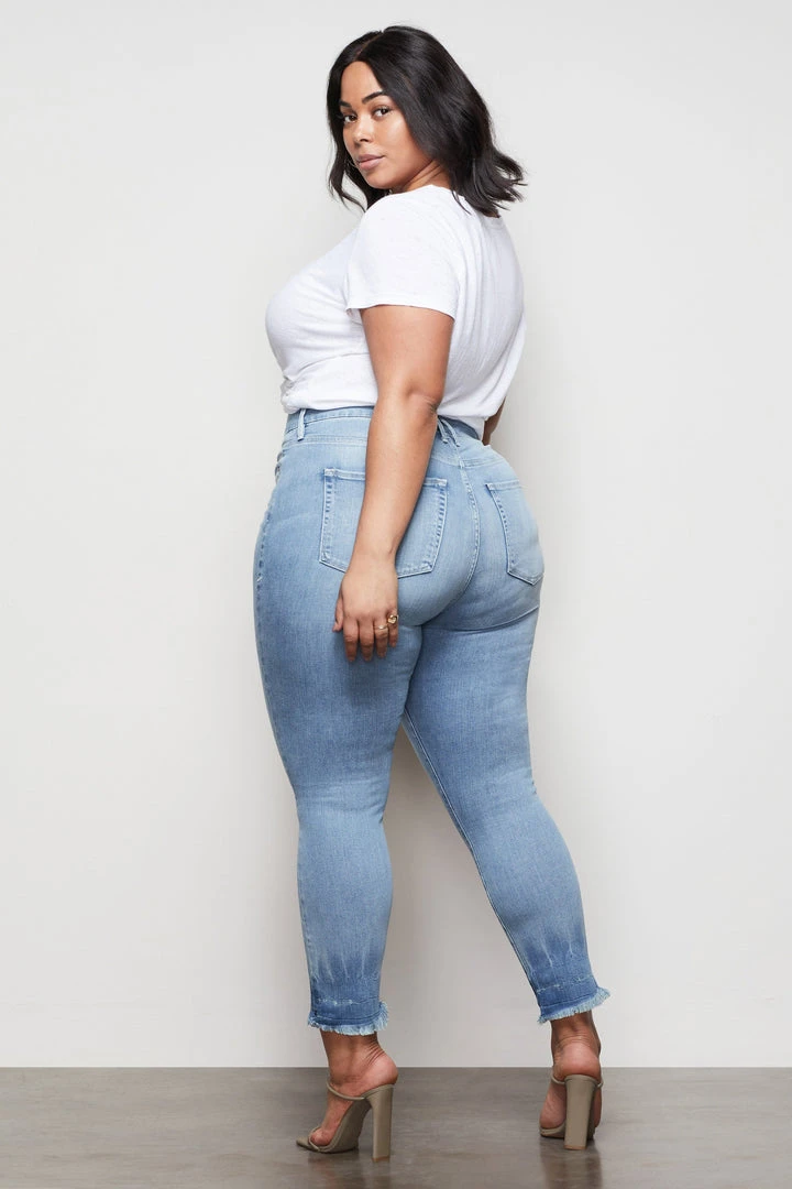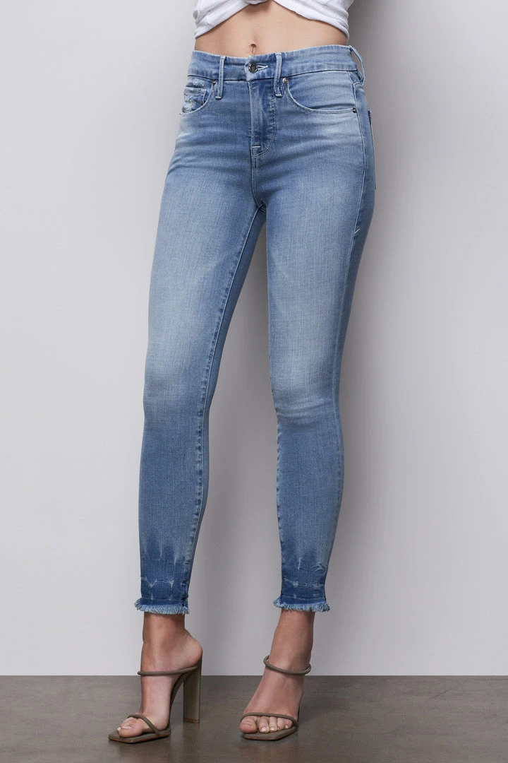 Good Legs, our best-selling skinny fit. A classic pair of blue jeans, updated with a frayed hem and shadow wash detailing at ankle.