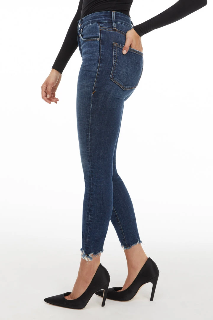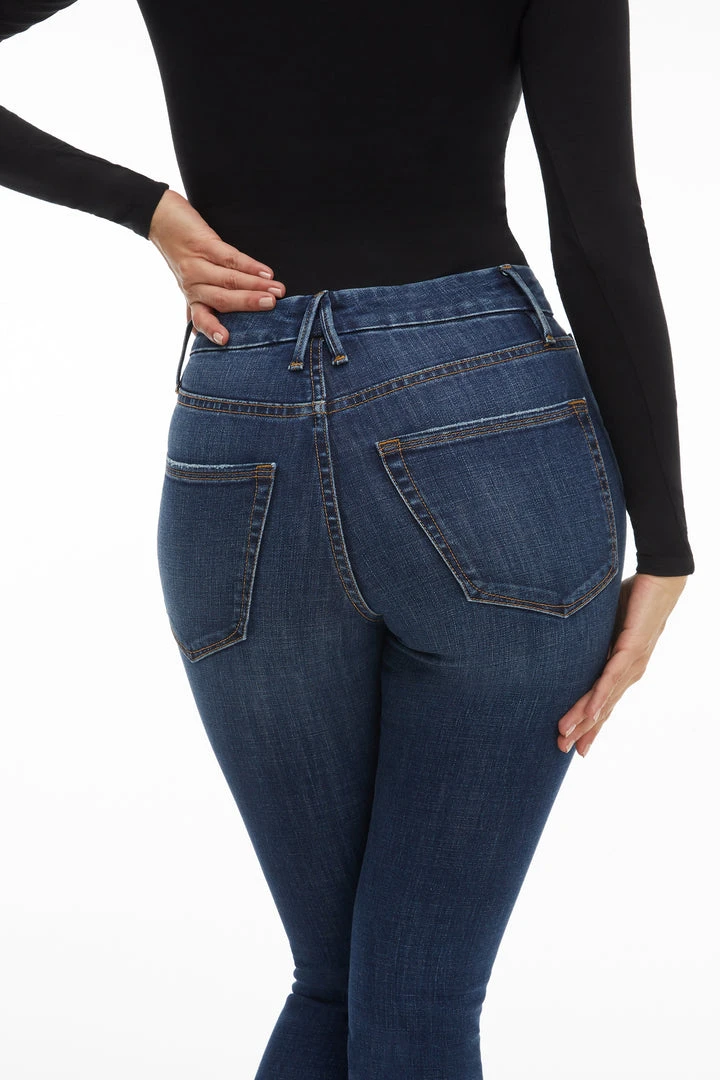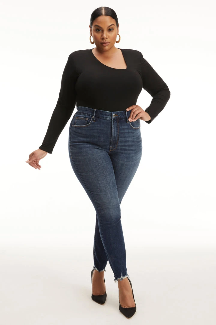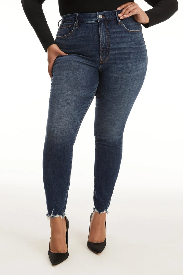 Good Legs, our best-selling skinny fit. A classic pair of blue jeans, updated with a chewed hem.