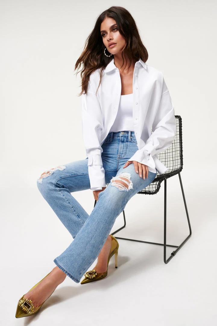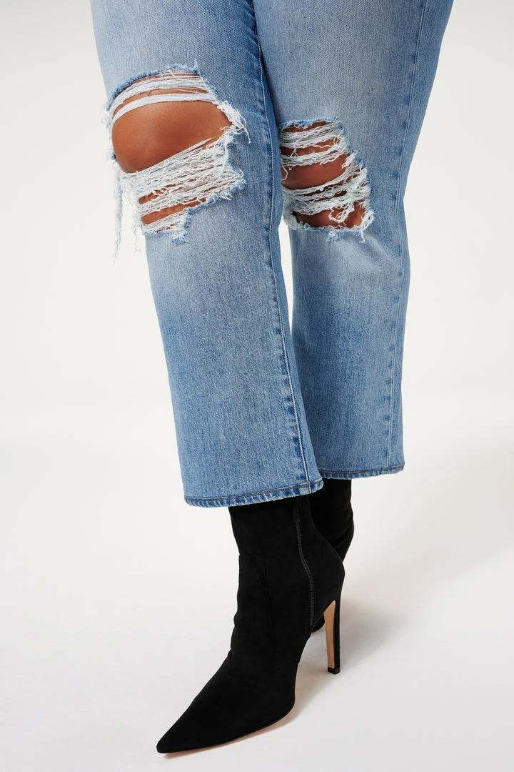 A high-rise vintage-inspired straight fit with flat tummy tech and a gap-proof waistband in smoothing denim. This classic jean is updated with a knee blowout and distressed hems.