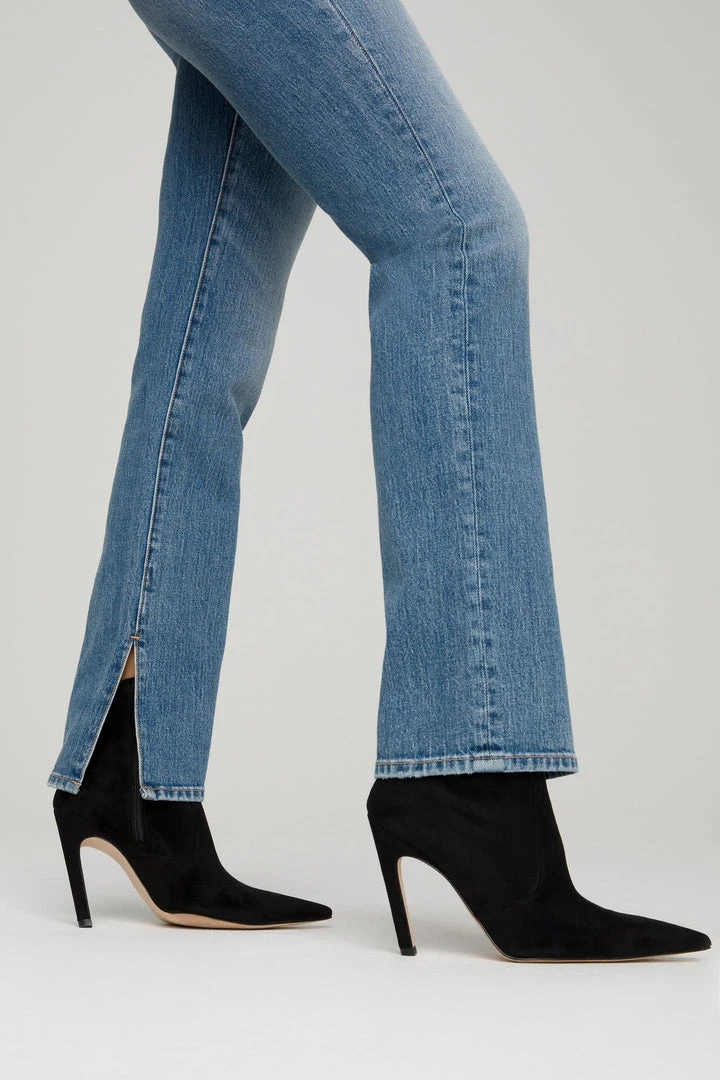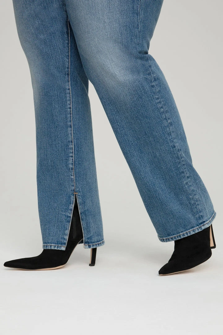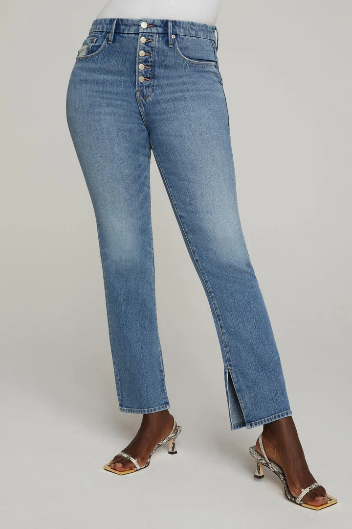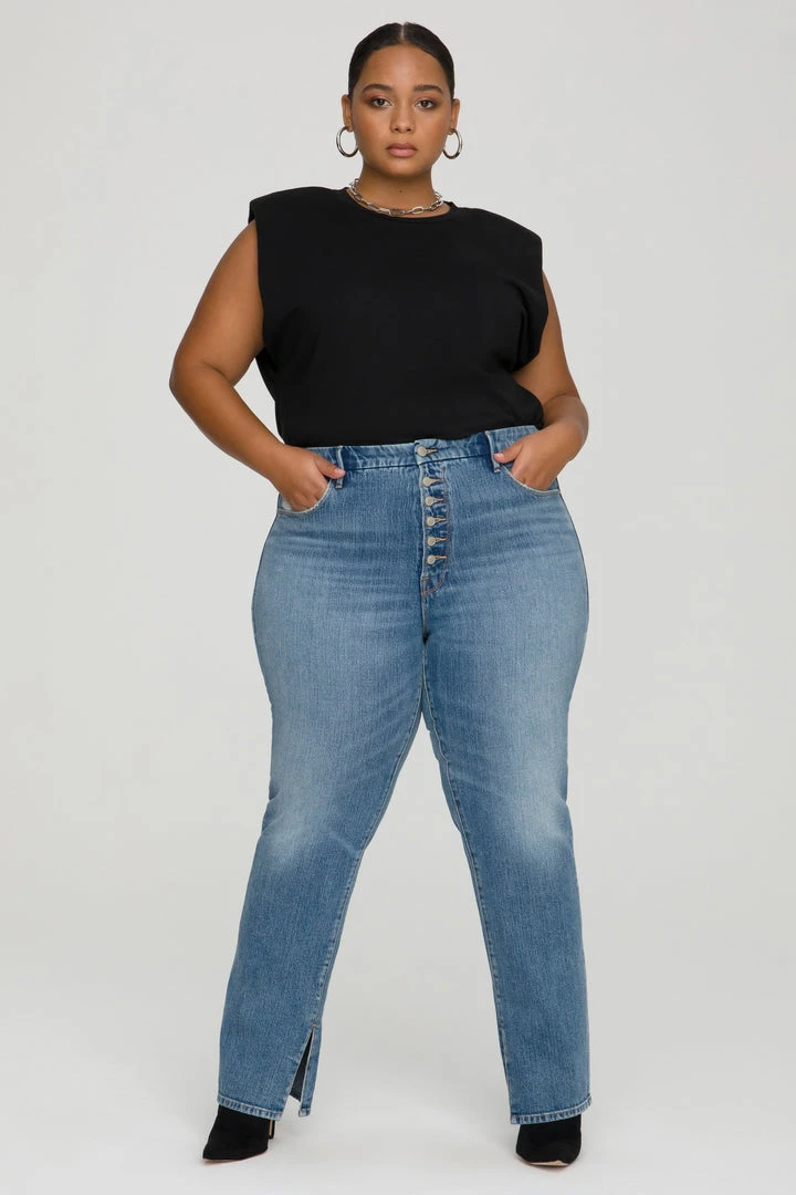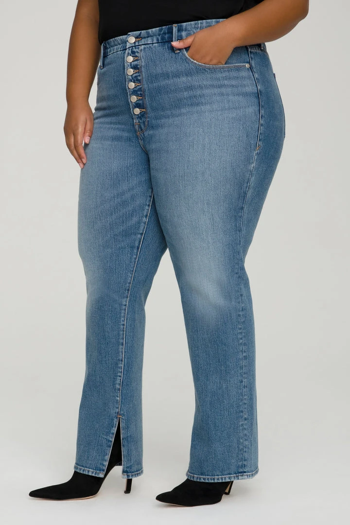 A super high rise boyfriend fit made to flatter every curve, in stretch fabric. Strut your stuff with exposed buttons and split hems