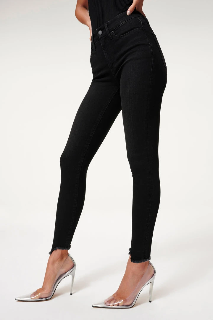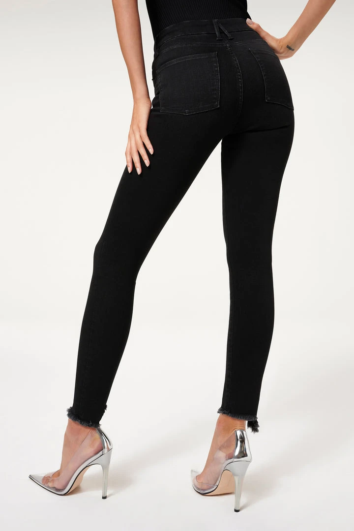 The ultimate high rise waist-shaper, Good Legs with a Stiletto update. Raw hem and classic black color make this pair your new go-to.