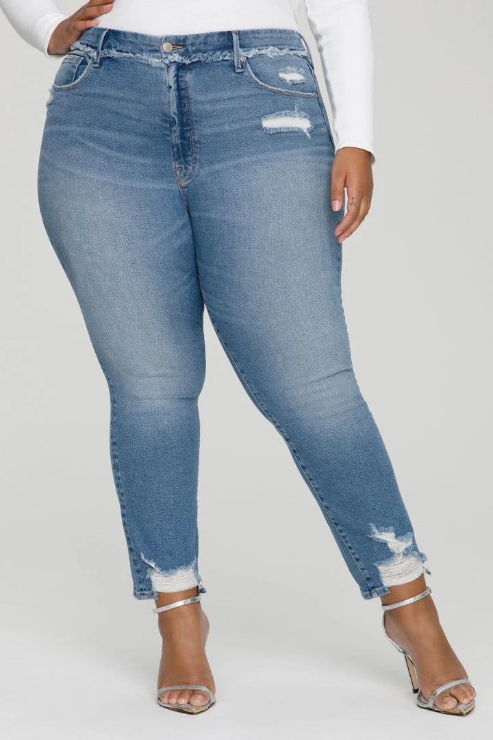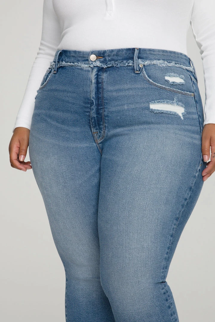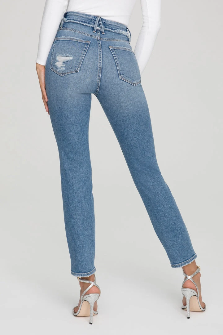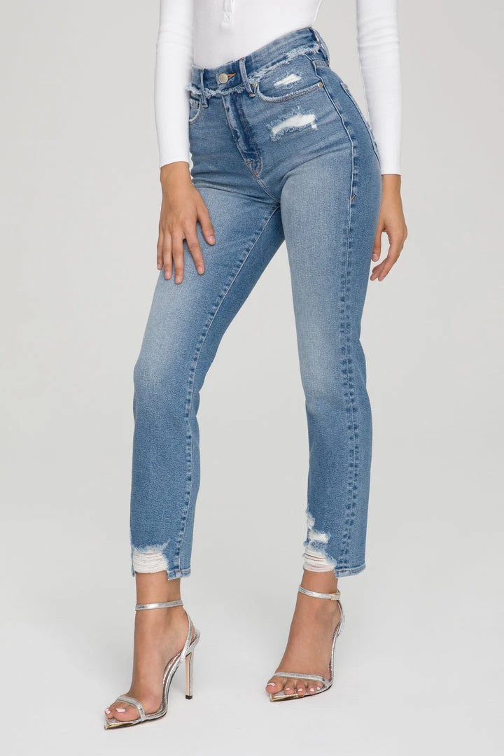 Classic straight leg jean, the Good Straight now with a frayed waistband and chewed hems.