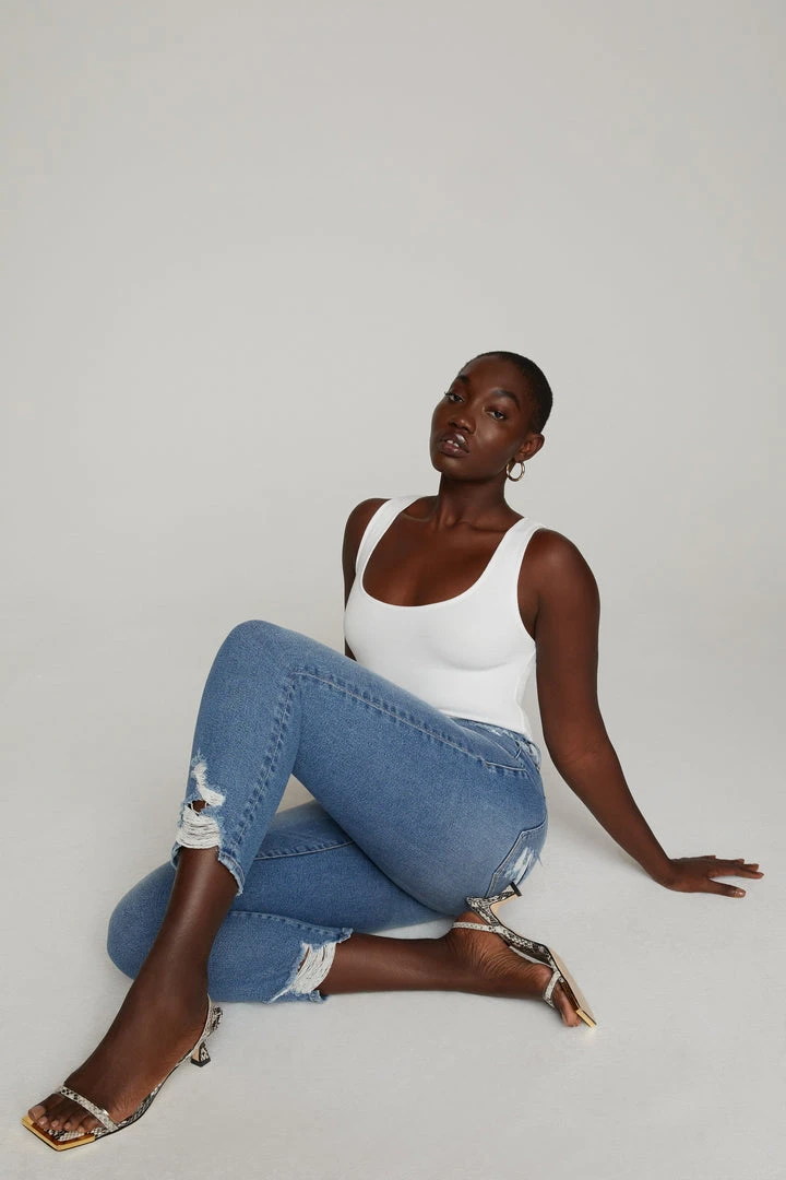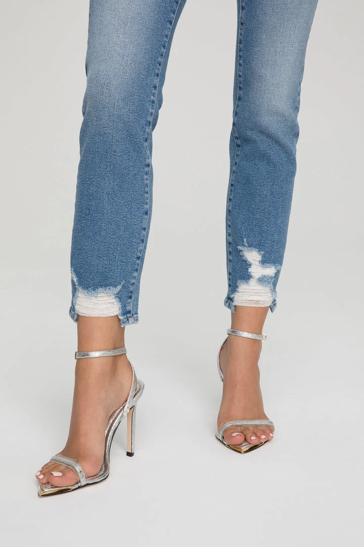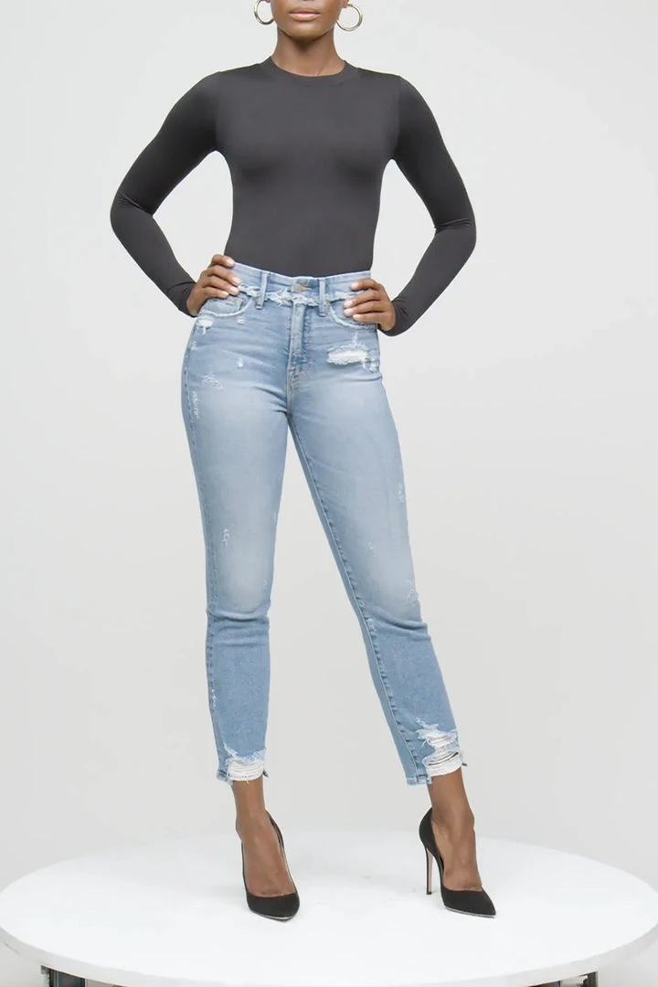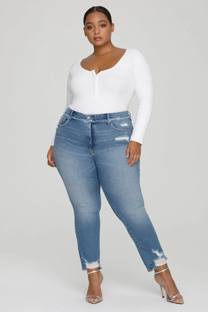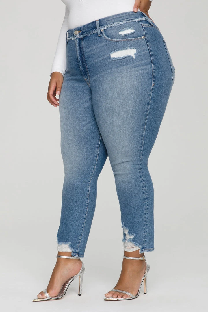 Classic straight leg jean, the Good Straight now with a frayed waistband and chewed hems.