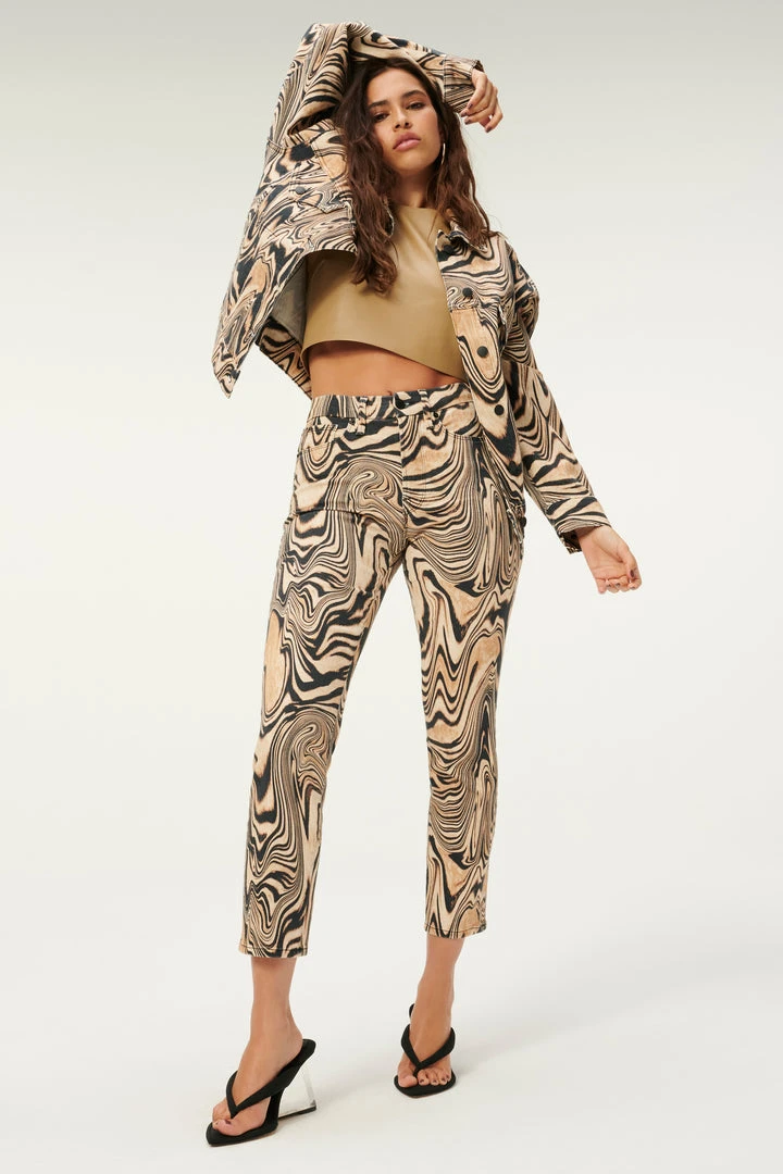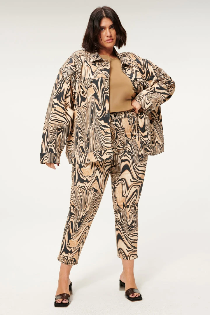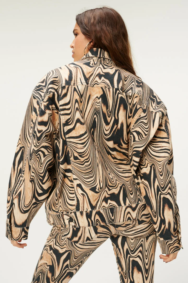 We’re obsessed with this oversized denim jacket. Introducing the Boyfriend Jacket Tan Swirl. Made to make you stand out in any crowd with our new swirl print.ย
