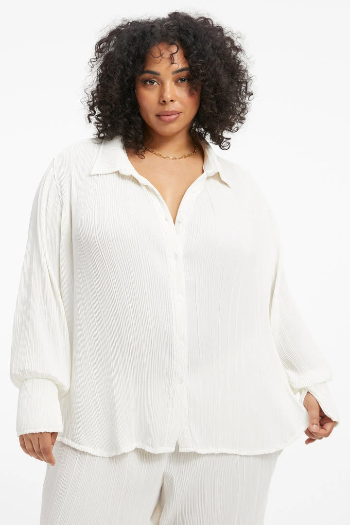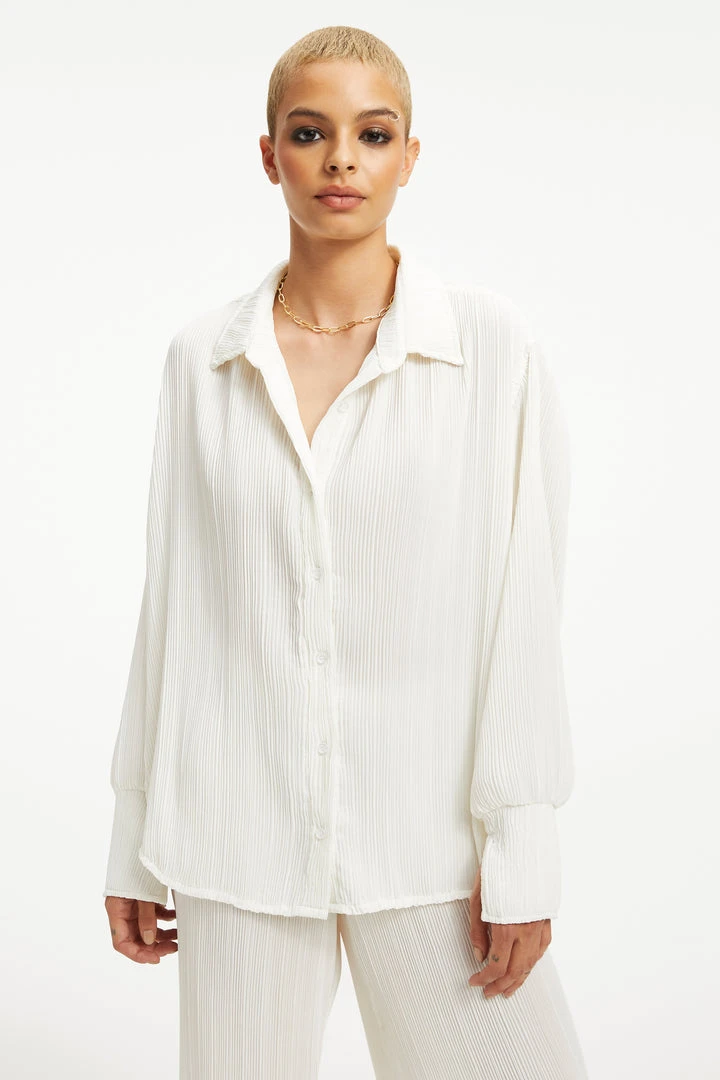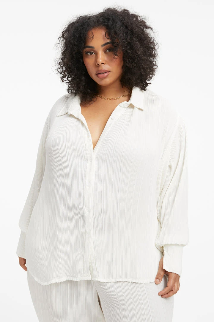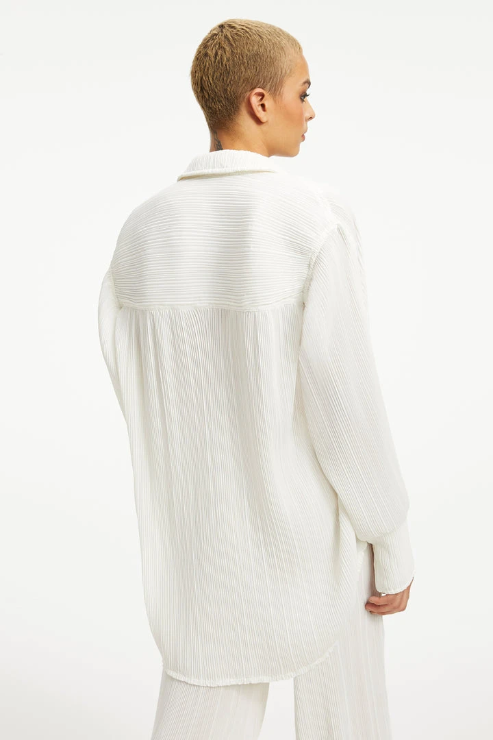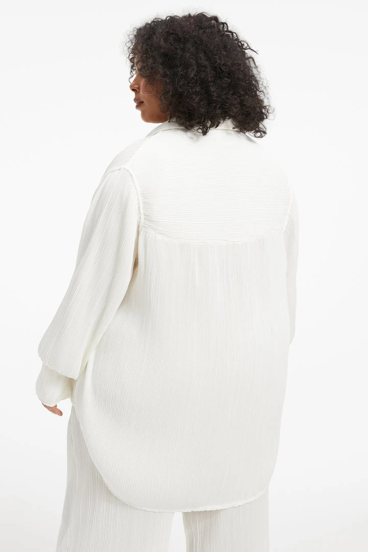 Play with texture in our Always Fits Plissé Shirt. It showcases a glossy shine and luxurious feel of this soft, pleat fabric. This style offers a more oversized look and drapes perfectly off the body. Pair it with our Plissé Wide Leg Pants for the ultimate day to night look.