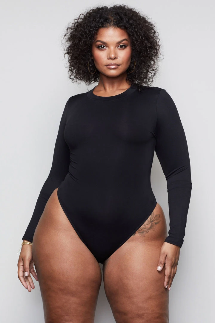 Long sleeve crew neck bodysuit. Ultra-soft matte breathable fabric. Tanga butt.