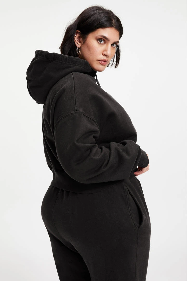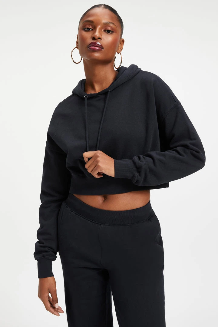 Pure comfort, still sexy. Maybe the hoodie that you and Khloé both love most? The Cropped & Cool Hoodie features a wide dropped shoulder, with super long sleeves. Generous knit rib cuff at wrist and waist for snug cozy feel against your skin.