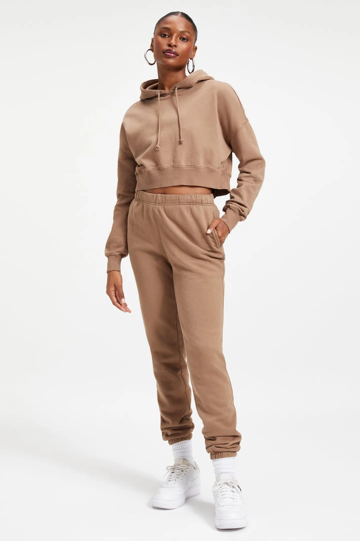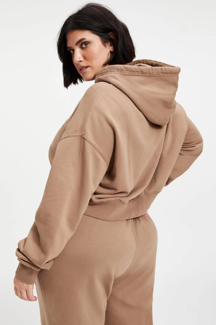 Pure comfort, still sexy. Maybe the hoodie that you and Khloé both love most? The Cropped & Cool Hoodie features a wide dropped shoulder, with super long sleeves. Generous knit rib cuff at wrist and waist for snug cozy feel against your skin.