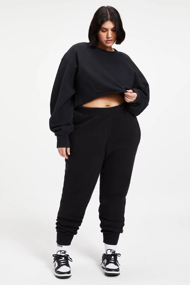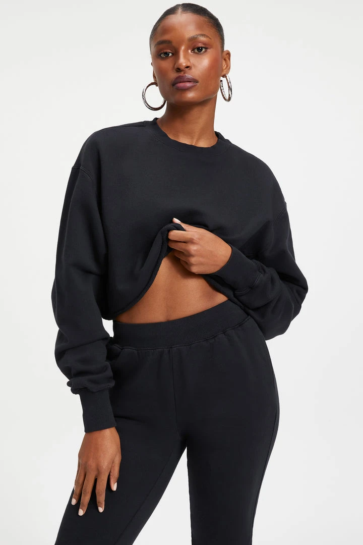 The Cropped & Cool Sweatshirt is your go-to exaggerated crew silhouette, and has ribbed side panels to hold this top away from your body. Dropped shoulder and extra long sleeve proportion give a baggy vibe, but not! Super cute with bike shorts or sweats.