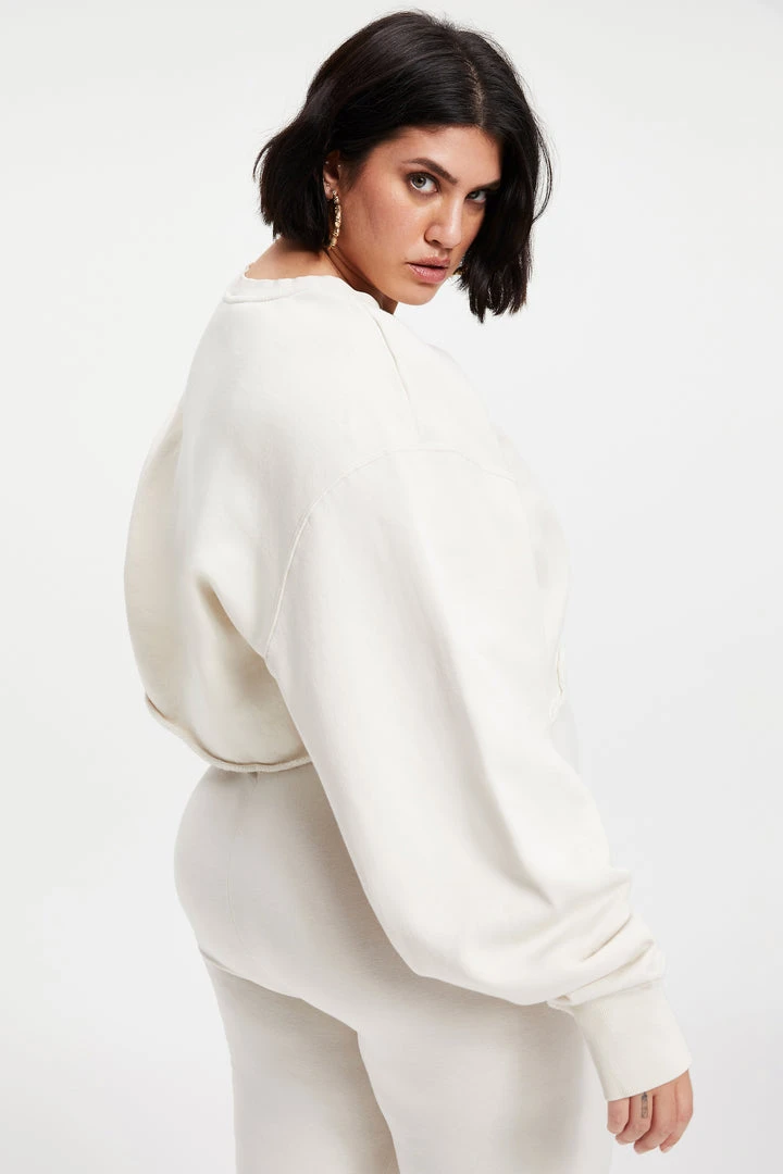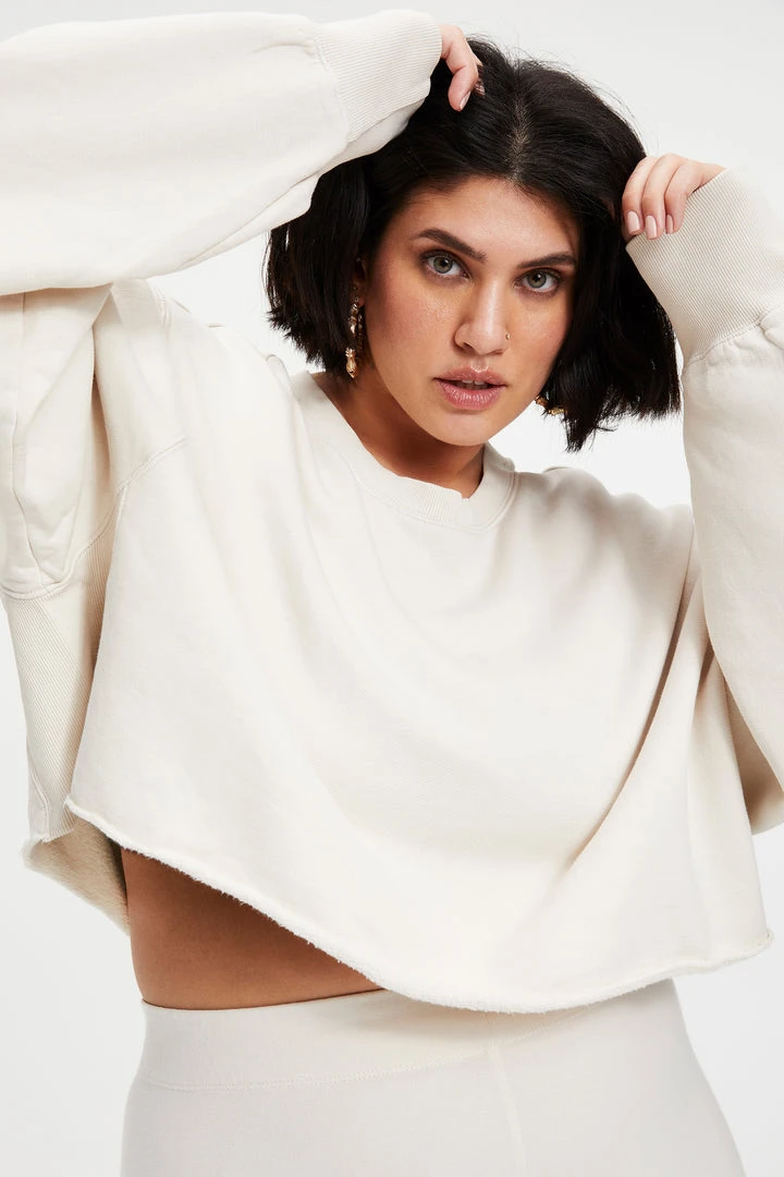 The Cropped & Cool Sweatshirt is your go-to exaggerated crew silhouette, and has ribbed side panels to hold this top away from your body. Dropped shoulder and extra long sleeve proportion give a baggy vibe, but not! Super cute with bike shorts or sweats.