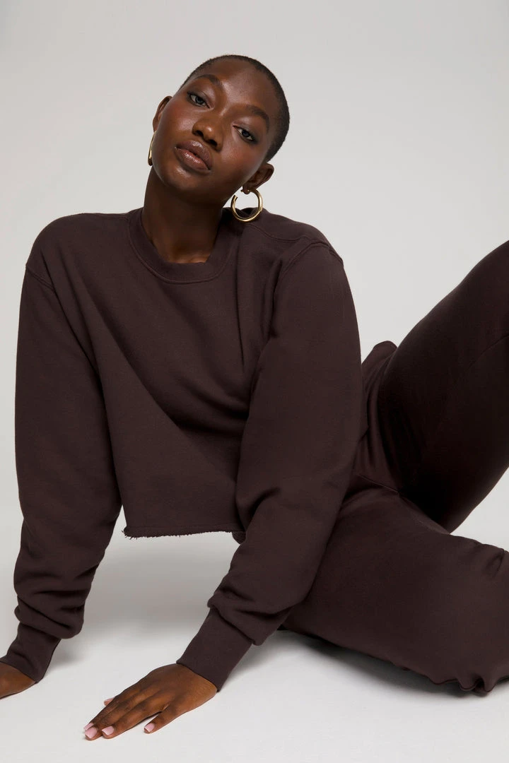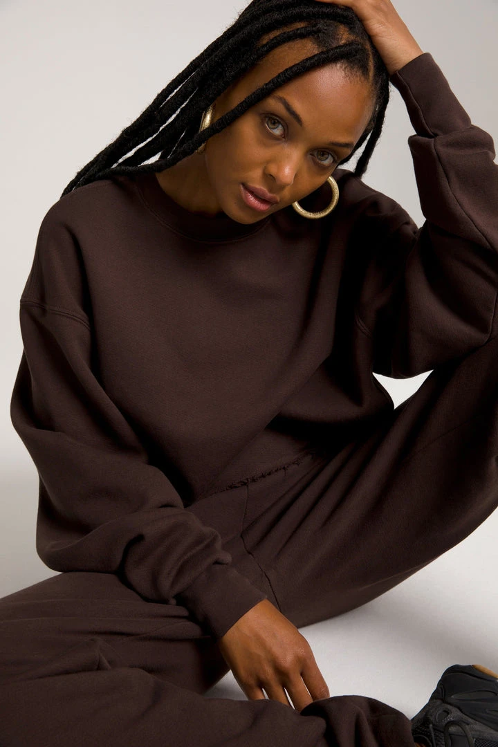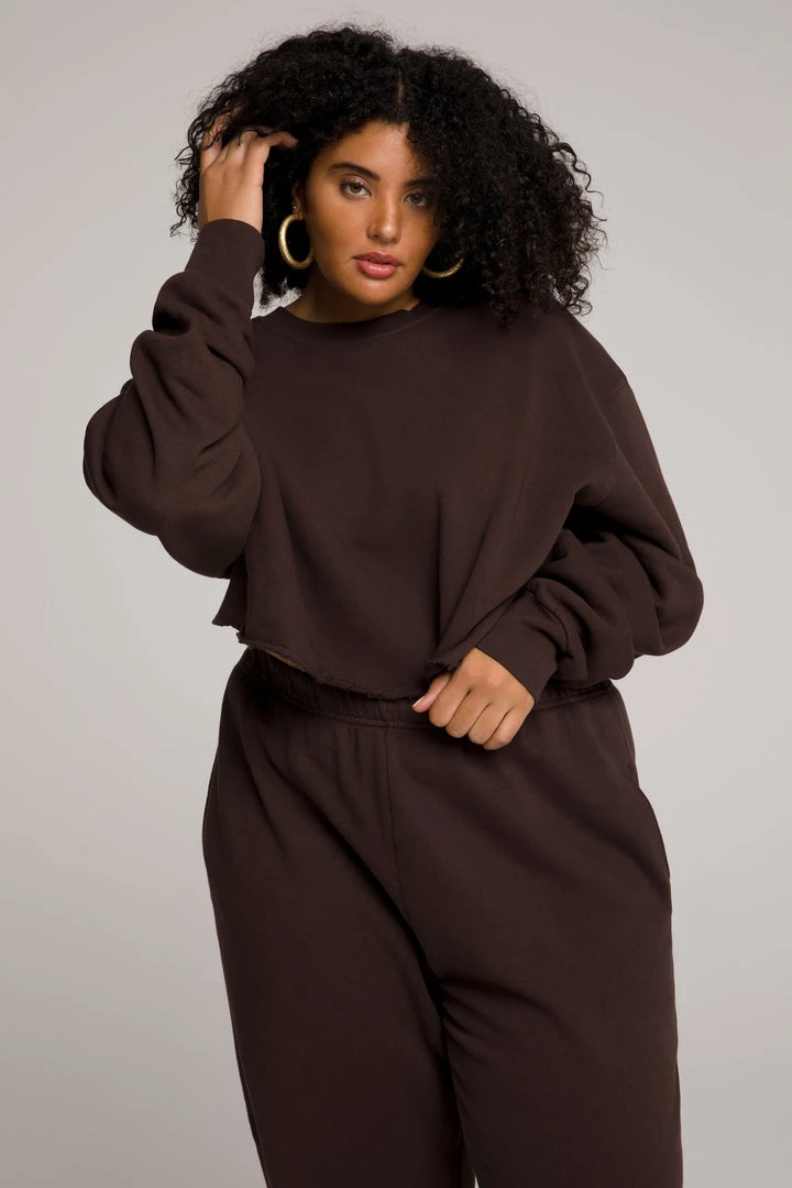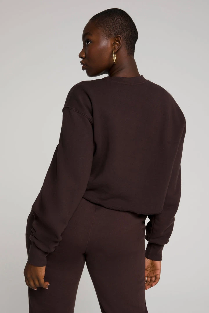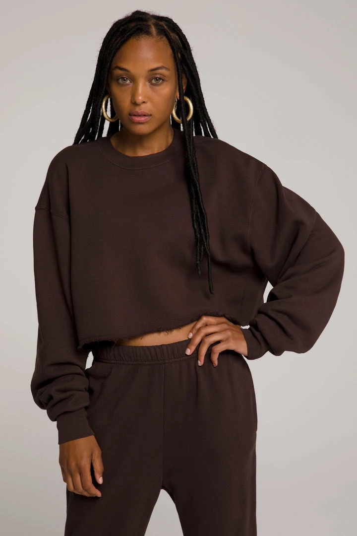 The Cropped & Cool Sweatshirt is your go-to exaggerated crew silhouette, and has ribbed side panels to hold this top away from your body. Dropped shoulder and extra long sleeve proportion give a baggy vibe, but not! Super cute with bike shorts or sweats.