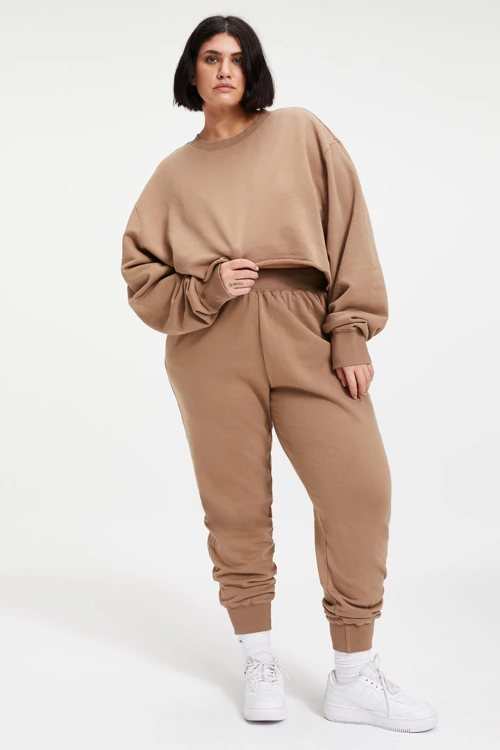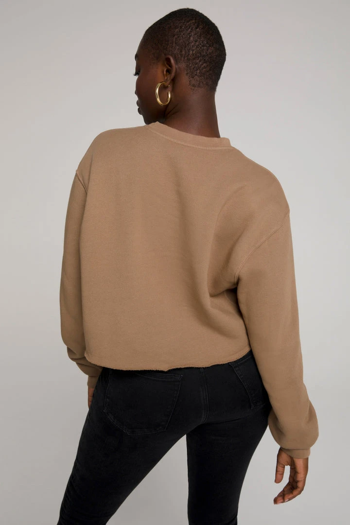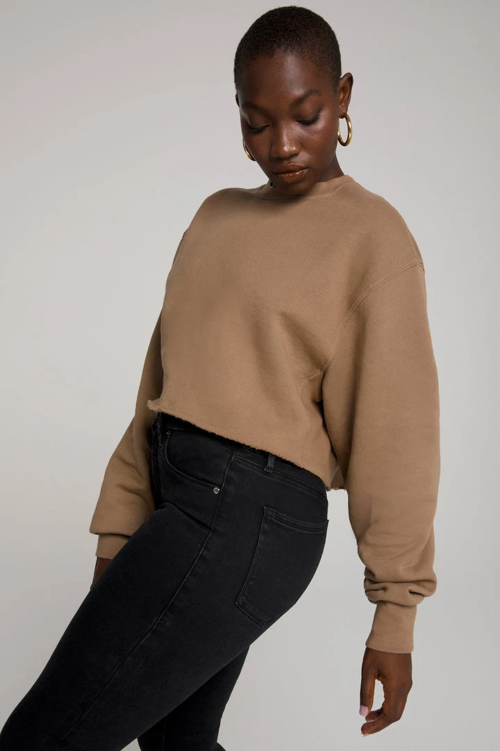 The Cropped & Cool Sweatshirt is your go-to exaggerated crew silhouette, and has ribbed side panels to hold this top away from your body. Dropped shoulder and extra long sleeve proportion give a baggy vibe, but not! Super cute with bike shorts or sweats.