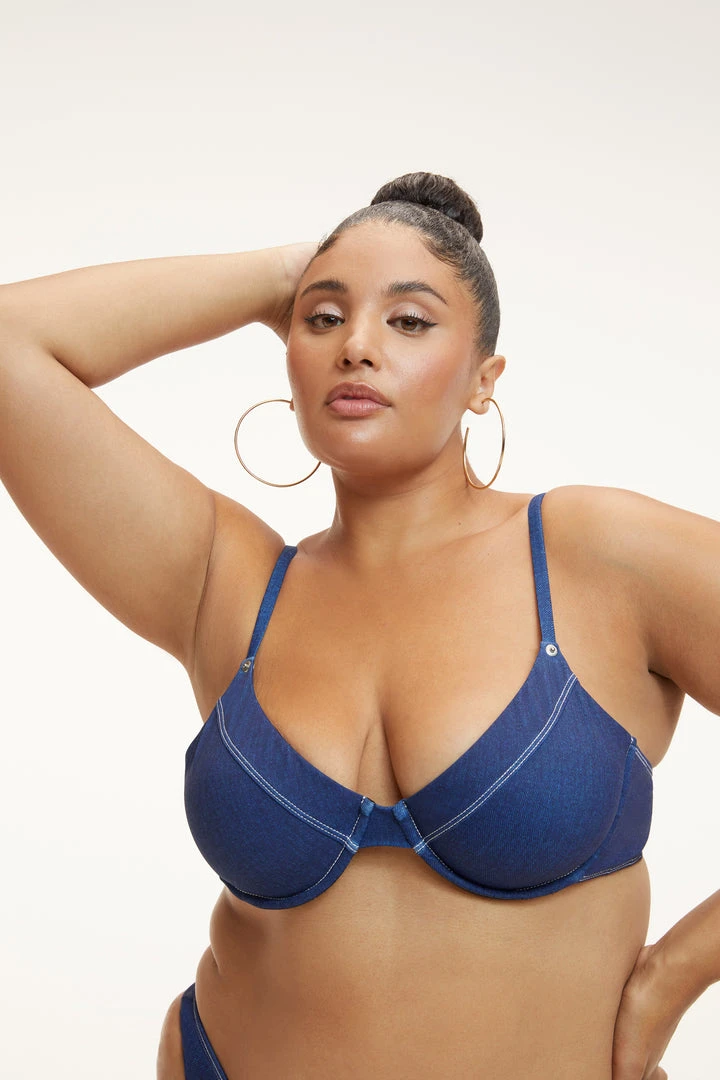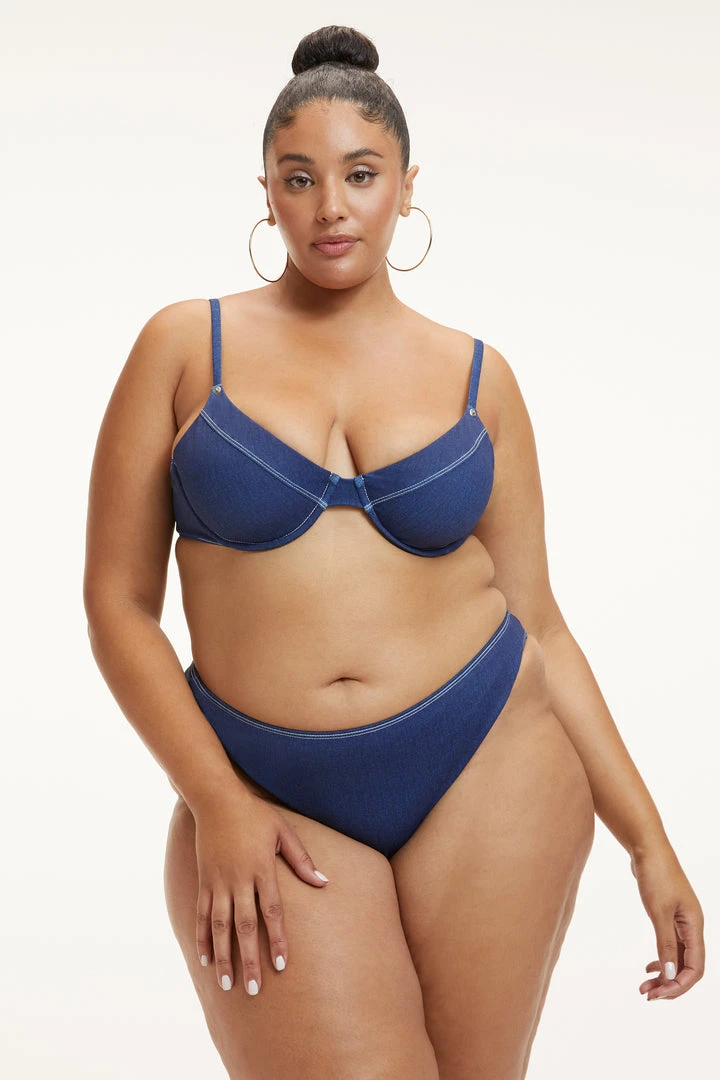 When the temperatures start rising it’s time to sport the Denim Demi Top. This beach-ready bikini top has a soft matte fabric with underwire support, a scoop neckline, and a back hook closure. Looks like denim, fits and feels like swim perfection. Pair with our Denim Better Bikini Bottom.
