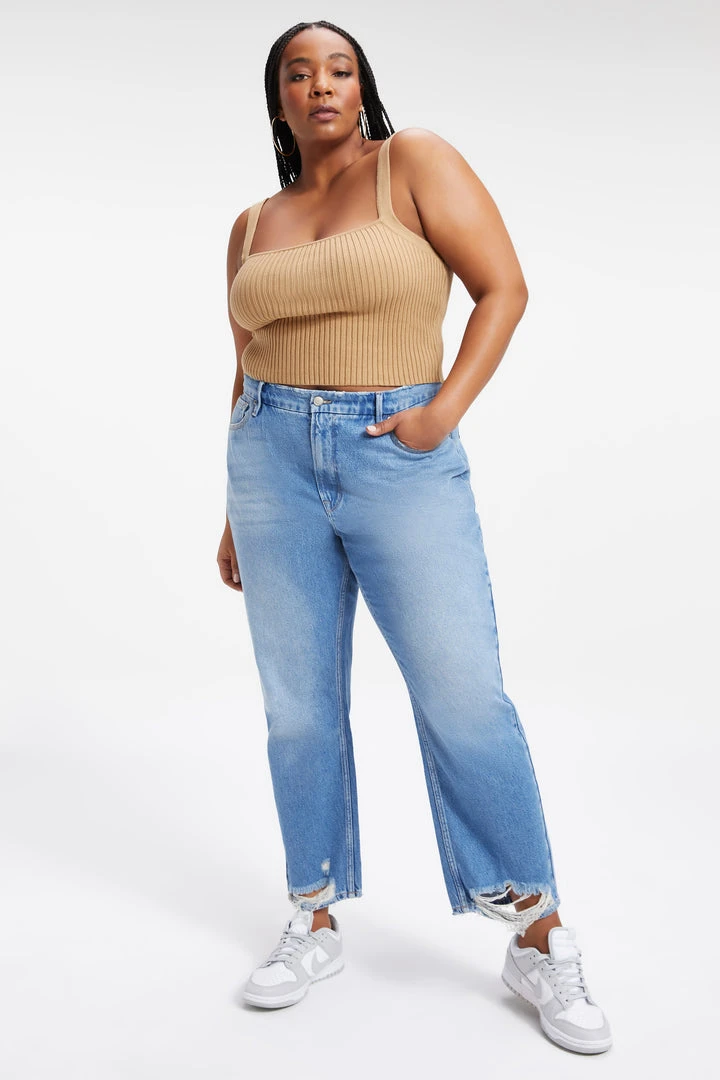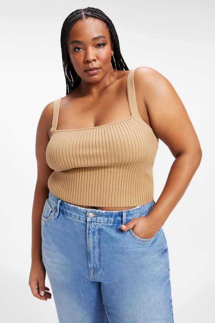 Cozy like a sweater, cute like a cami. THE must-have ‘90s Knitted Tank features wide spaghetti straps, soft textured fine rib detailing and the perfect cropped length. Pair with your go-to oversized jeans.