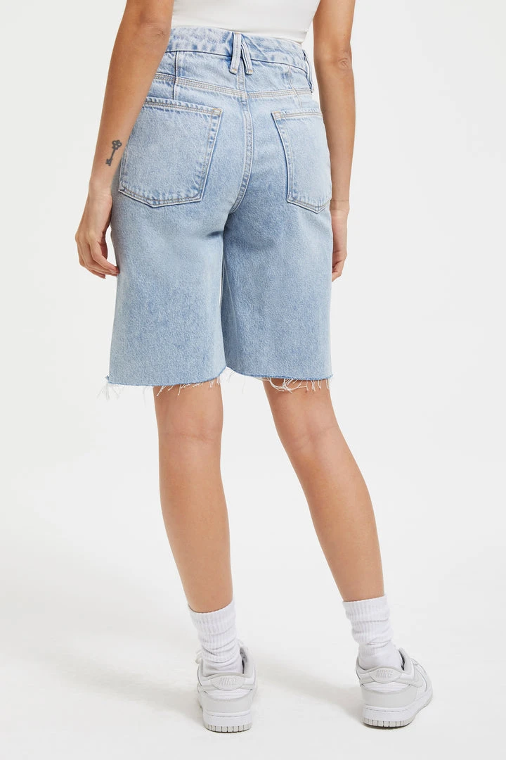 Be festival ready in our updated Good 90s. The perfect sculpted fit, blown out knees, strategic hem destruction – all the festival ready details you need. Our new ’90s-inspired denim short is roomy, comfy, and still sexy. With a high waist and straight leg, this bermuda short is oversized yet more form-fitting.