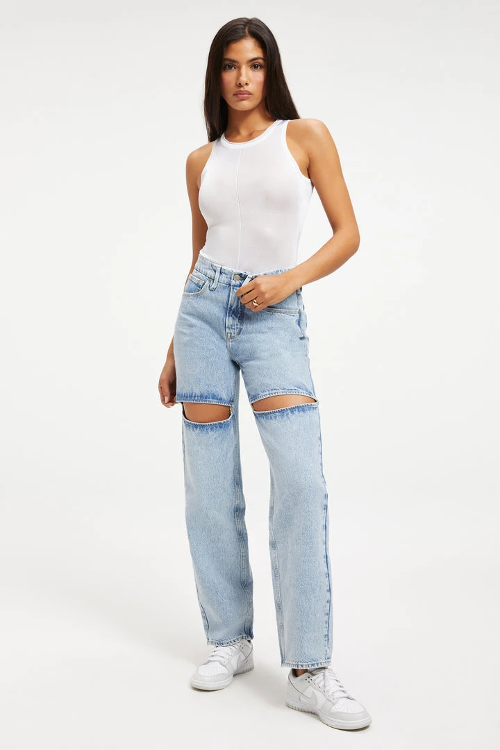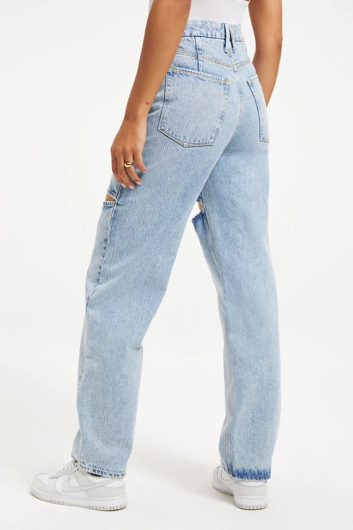 Weโre so over super-tight skinny jeans. Our new ’90s-inspired denim is roomy, comfy, and still sexy. With a high waist and straight leg, this jean is oversized yet more form-fitting than Good โ90s Loose. We updated this style with some side thigh slits for an extra touch of sexiness. Throw on your favorite kicks for that chill yet chic look any day of the week.