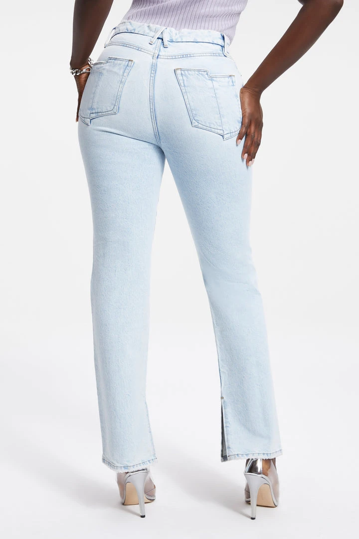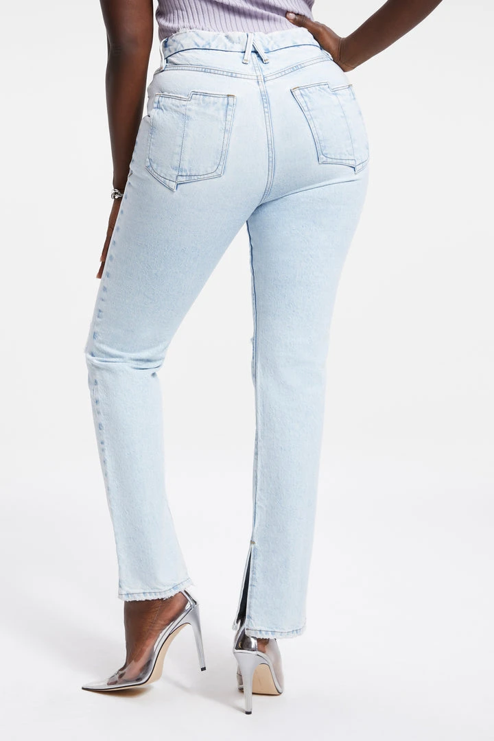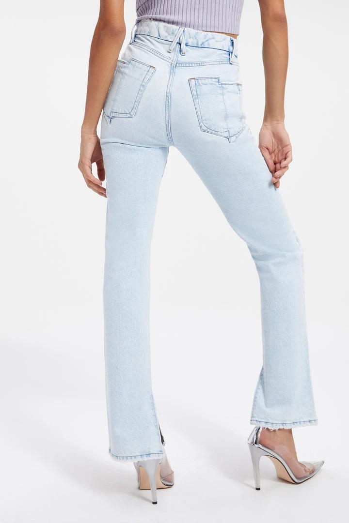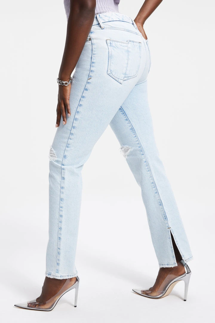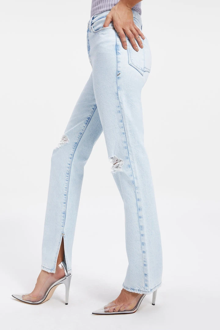A super high rise slim boyfriend fit made to flatter every curve, in stretch fabric. The Good Boy Split Pockets is cut from a denim in a light blue wash with distressing throughout for that worn-in love vintage appeal. They fit comfortably high at the waist and hugs your hips perfectly. Strut your stuff with the new addition of slit hems to show off those shoes.