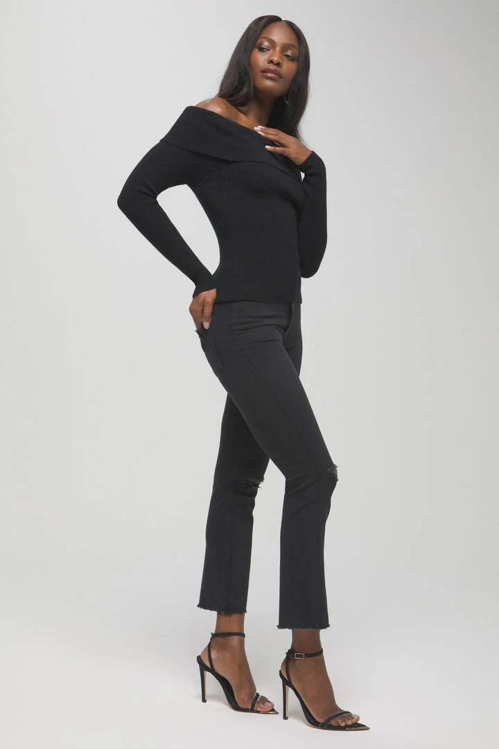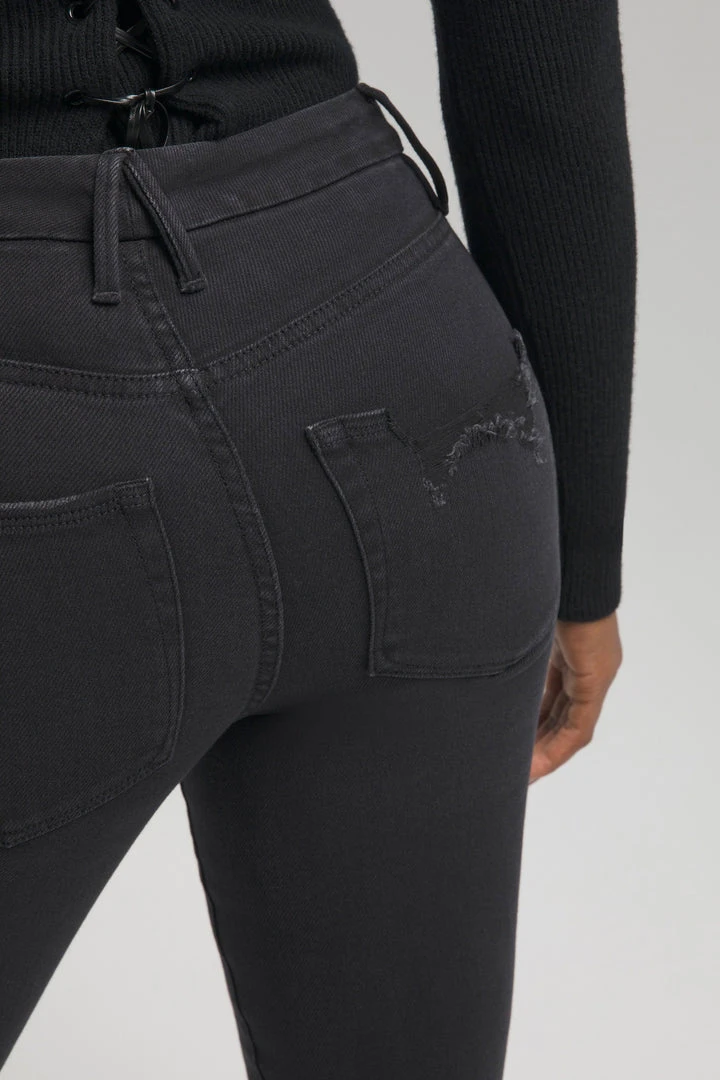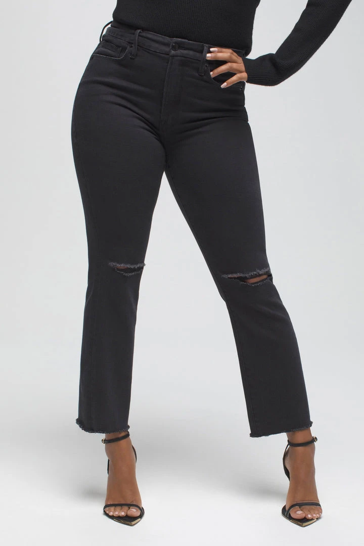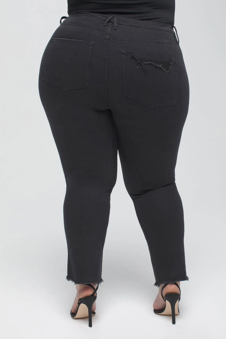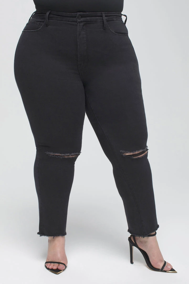 Good Straight, a classic straight leg jean updated with double knee blowouts and raw hems.
