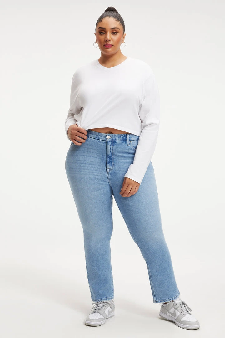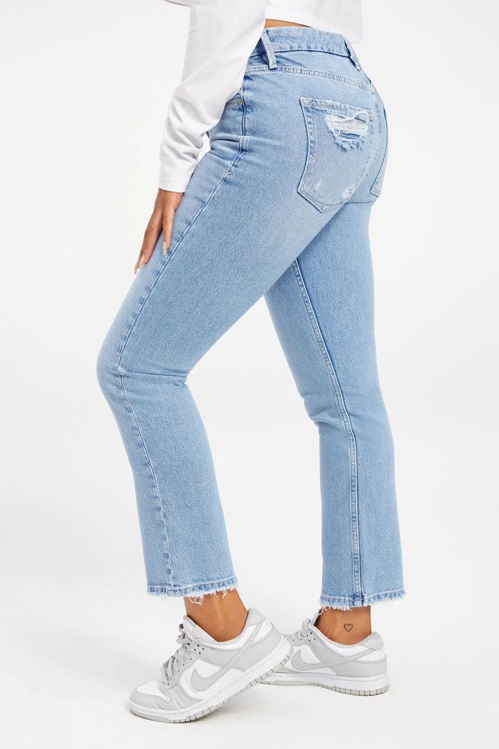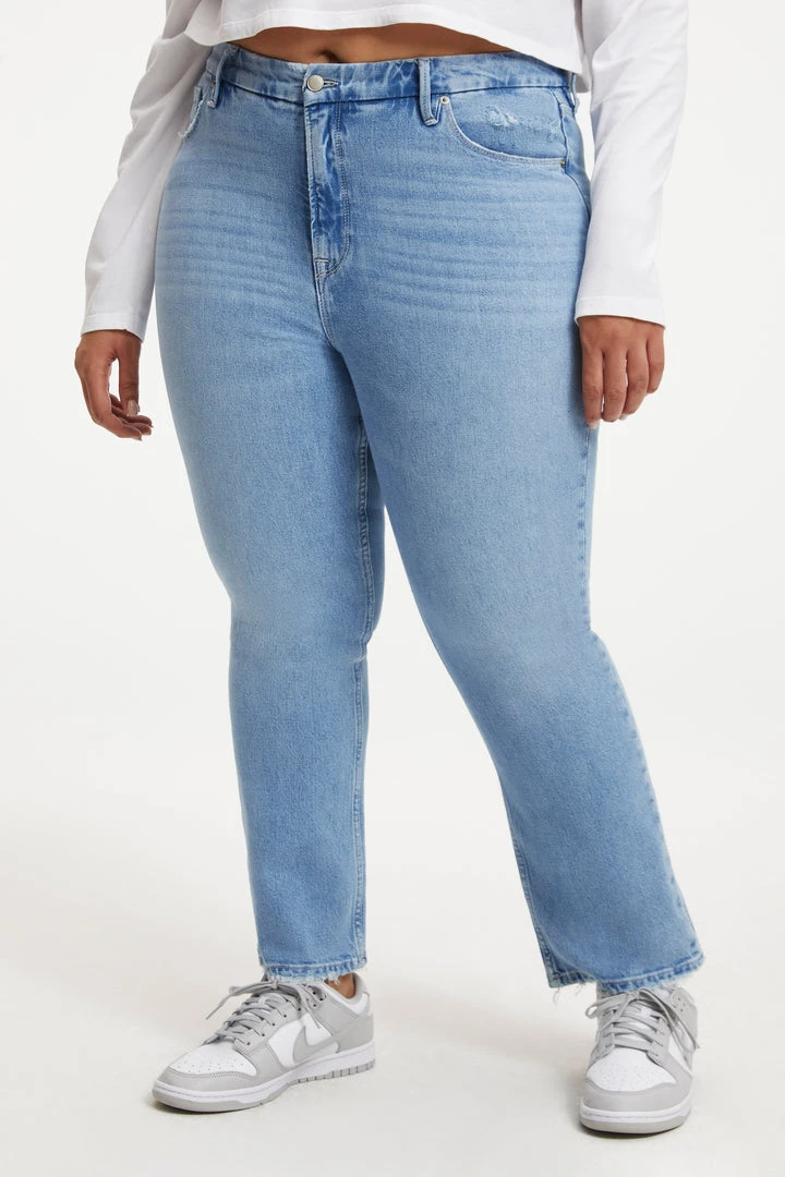 A high-rise vintage-inspired straight fit with flat tummy tech and a gap-proof waistband in smoothing denim. This classic jean is updated withย distressed pockets for that worn-in-love feel.