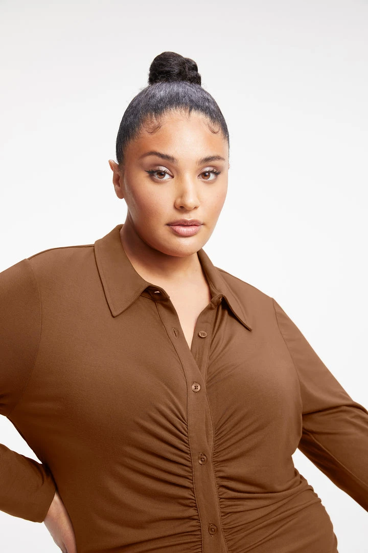 Designed to exude confidence, the Good Touch Button Front Midi is a dress worth making plans for. With a button down front and ruching designed to define your figure and flatter every curve, you will definitely be turning heads in this dress. It is made with the softest sculpting fabric that you’ll never want to take off. Pair with your favorite heels to finish off the look.