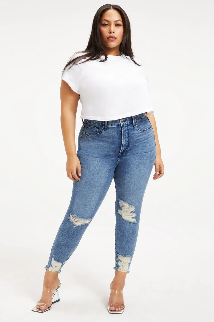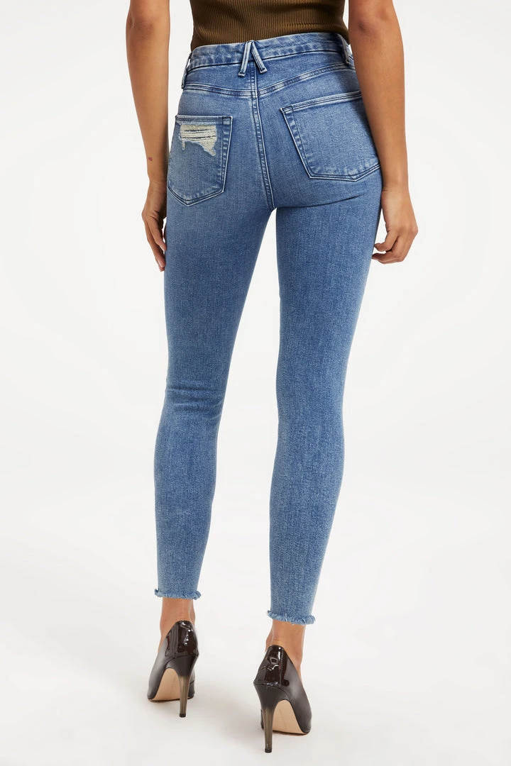 The ultimate high rise waist-shaper, the Good Waist. This classic jean is updated with a two knee distressing and chewed hems.