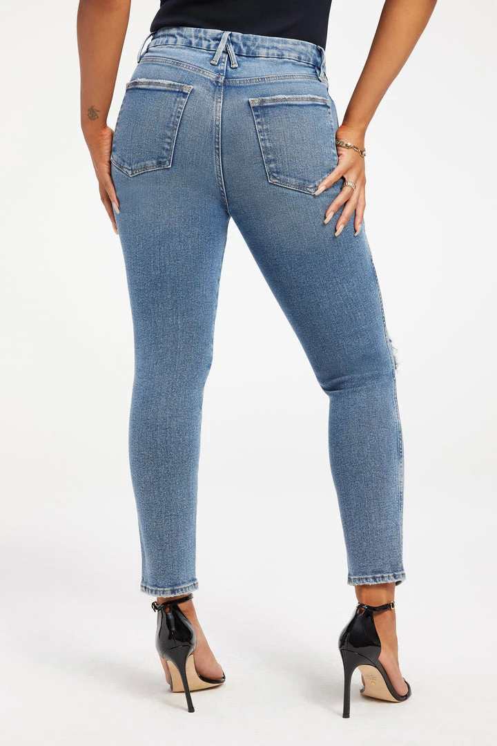Corset-contouring elasticity on a classic skinny leg jean, the Good Curve Skinny Crop has distressed details and a clean hem edge.