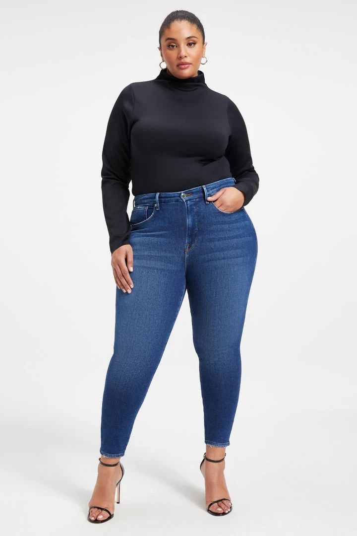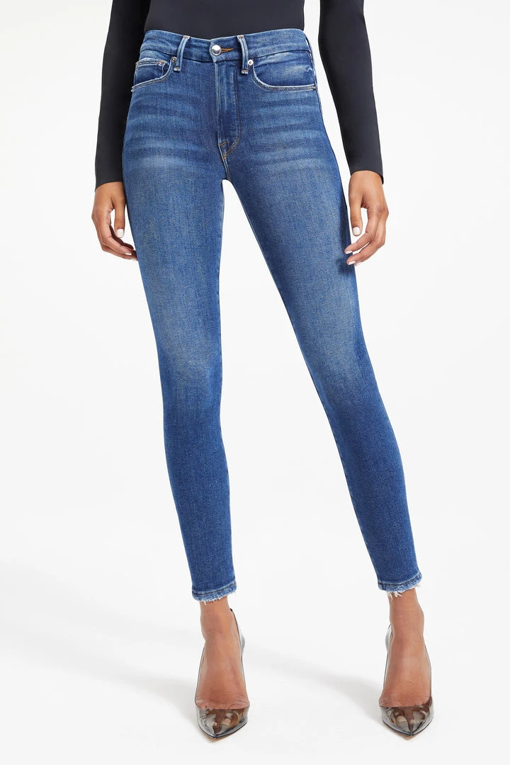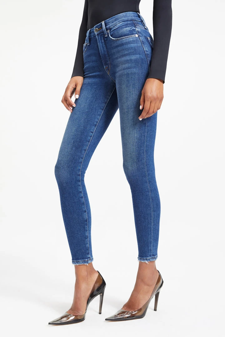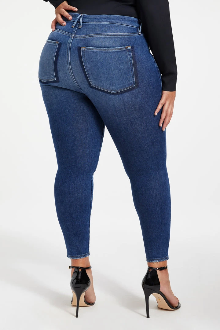 Our #1 best-selling high rise, skinny fit stretch jean in a classic dark blue wash. The Good Legs Shadow Pockets are made with a gap-proof contoured waistband and a high waist that’s sure to flatter every curve.