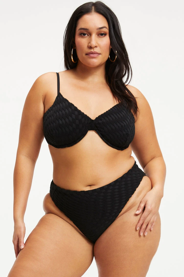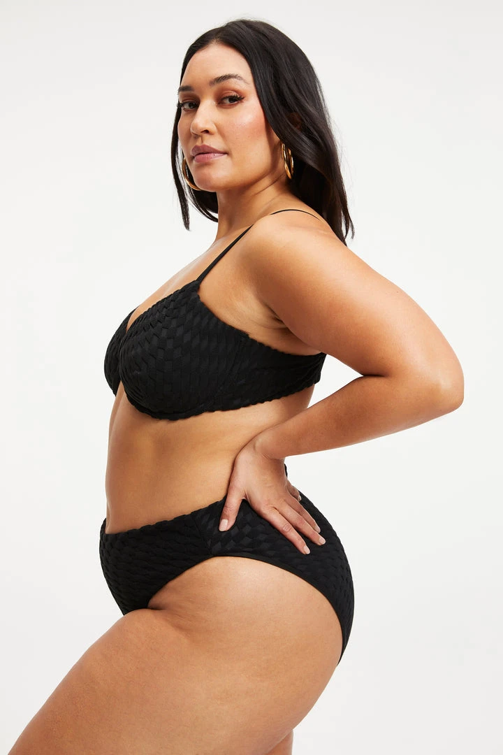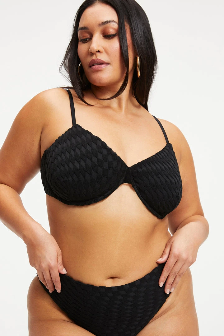 When the temperatures start rising it’s time to sport the Jacquard Demi Top. This beach-ready bikini top has a terry woven fabric with underwire support, a scoop neckline, and a back hook closure. Pair with our Jacquard Good Waist Bottom.