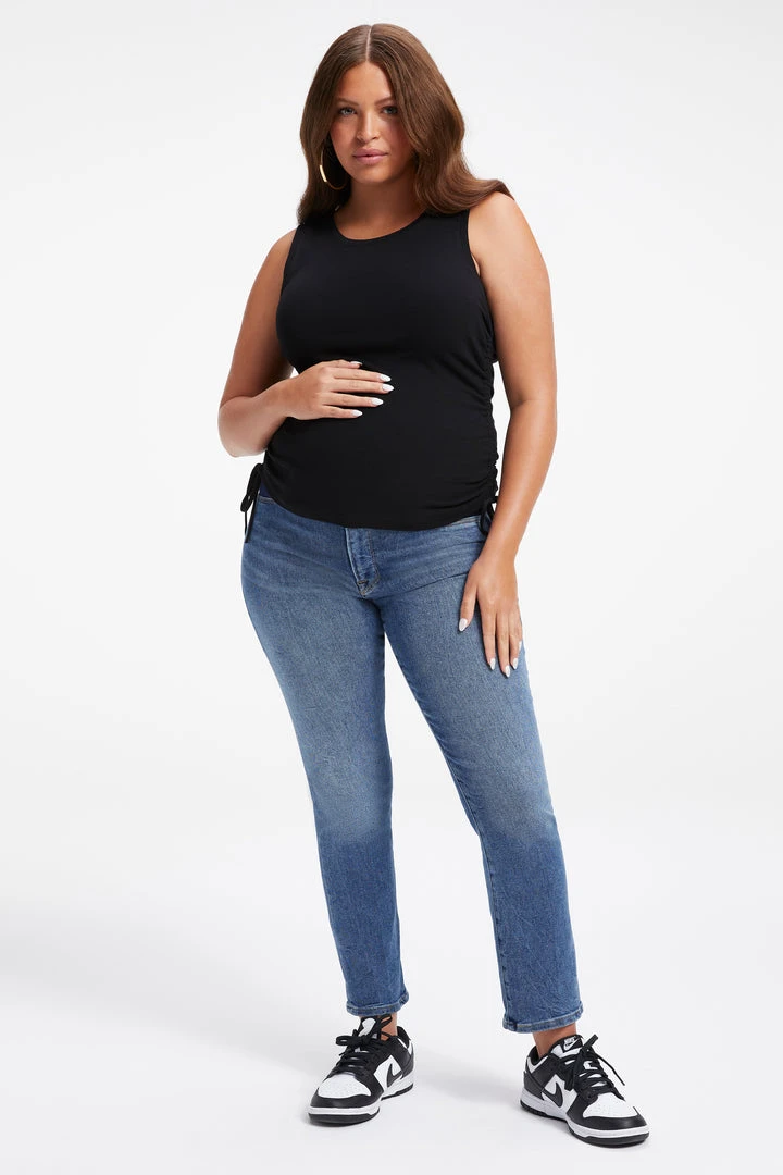 An easy tank with adjustable ruching along the sides. This is the perfect top for all of those expecting moms in their 1st and 2nd trimester. Throw on with your favorite pair of jeans for an effortlessly cool look.
