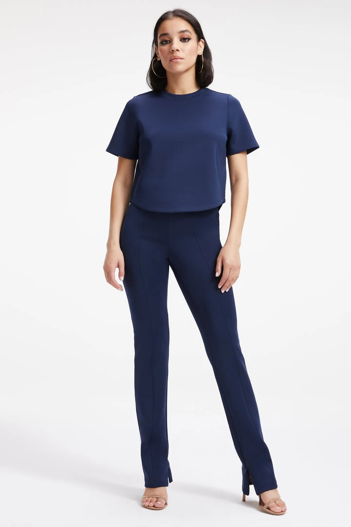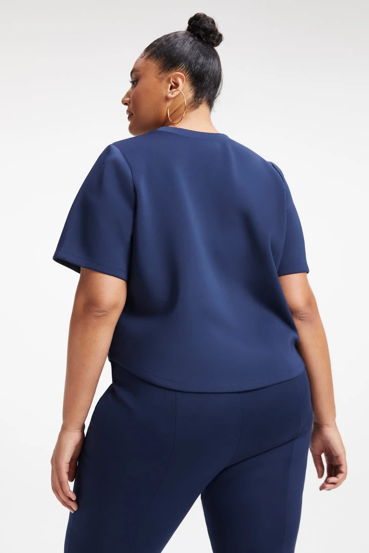 Our Scuba Tee is an essential from day to night. The stretch material gives a slightly loose fit that drapes nicely and pairs perfectly with anything high-waisted.