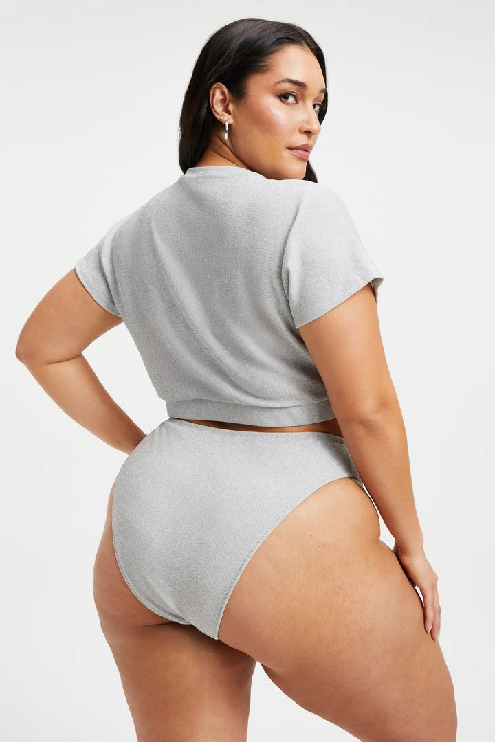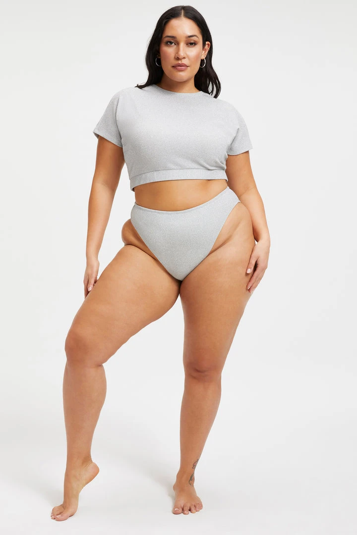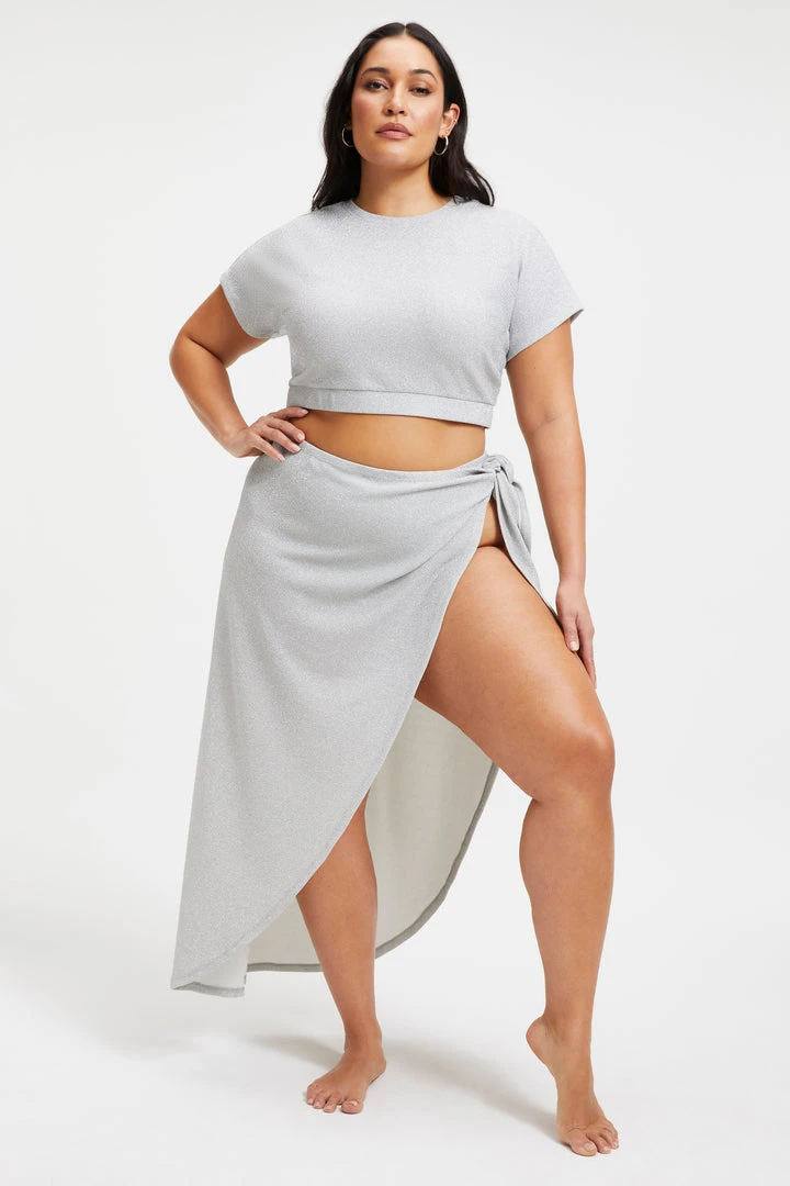 Equal parts simple yet chic, the Sparkle Crop Tee will be your new closet staple for the summer wardrobe. This tee features a cropped, crewneck silhouette in a soft shimmer fabric. Pair with our Sparkle Wide Leg Pant.