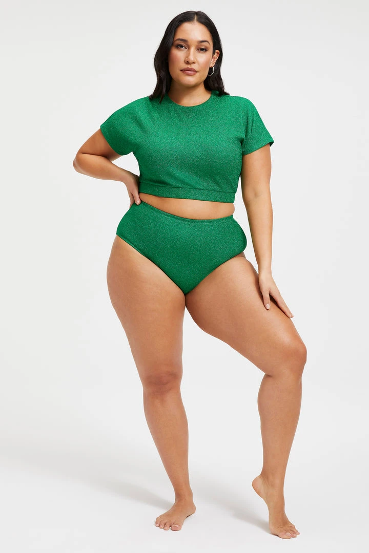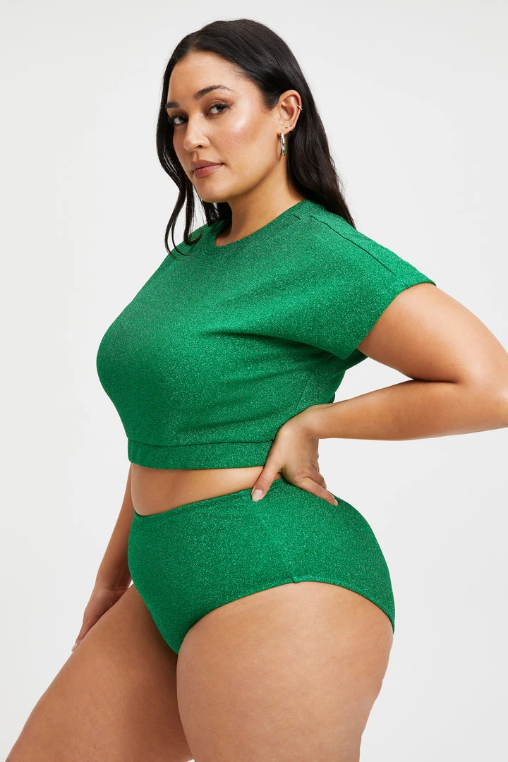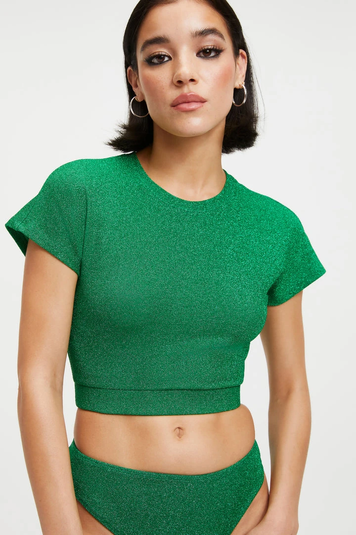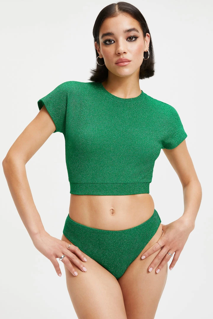 Equal parts simple yet chic, the Sparkle Crop Tee will be your new closet staple for the summer wardrobe. This tee features a cropped, crewneck silhouette in a soft shimmer fabric. Pair with our Sparkle Wide Leg Pant.