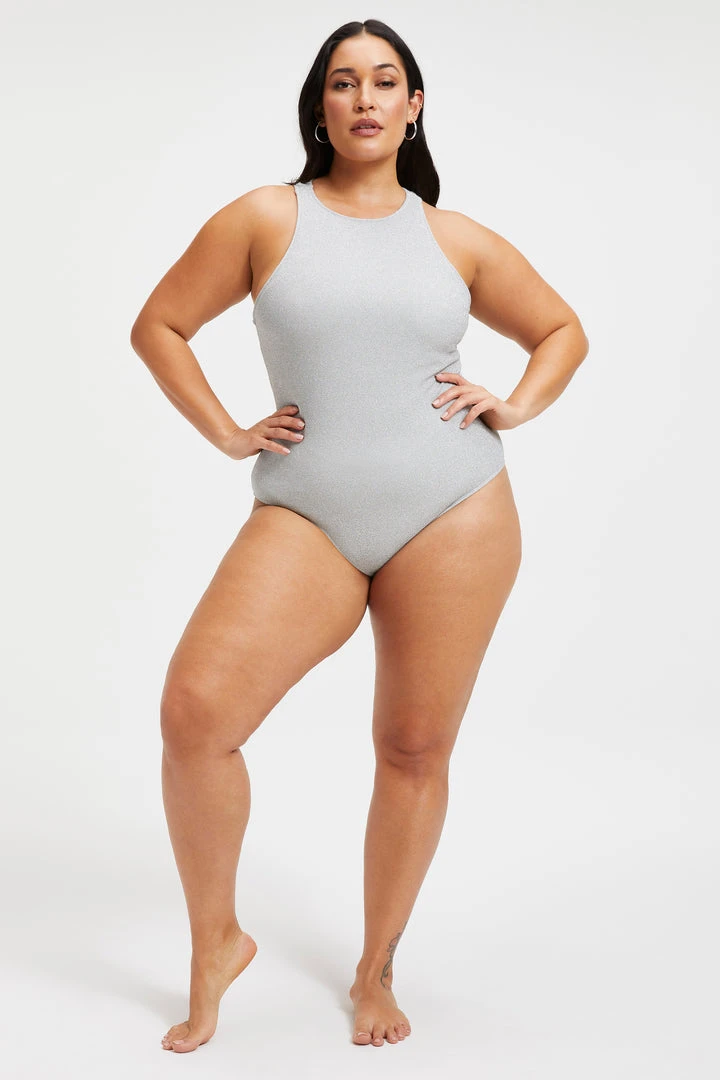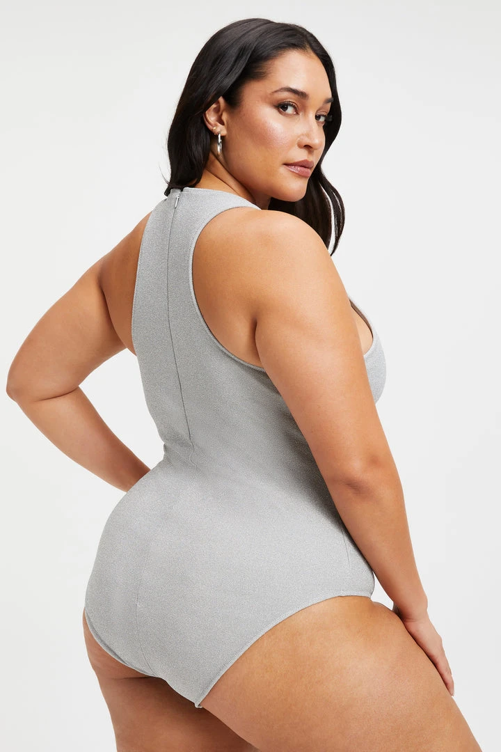 Your new essential one piece that just as chic lounging by the pool as it is styled under your favorite pair of jeans. The Sparkle Racer Neck One-Piece is designed with a racer neck front that beautifully frames your décolletage. It is cut from a soft shimmer fabric that keeps its shape, and supports a flattering fit.