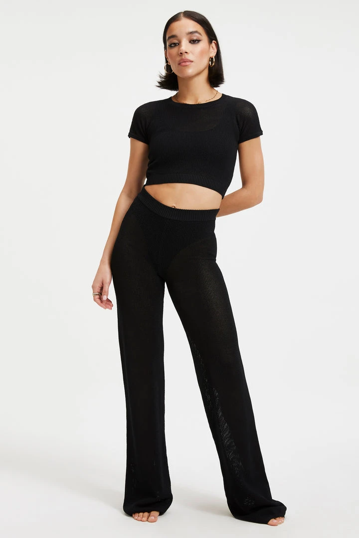 Turn up the heat in thisย Sweater Mesh Crop Tee. The perfect bathing suit cover up that makes you feel sexy and chic. This is a summer must have, with how light and airy it is. Pair with theย Sweater Meshย Bootcut to complete the look.