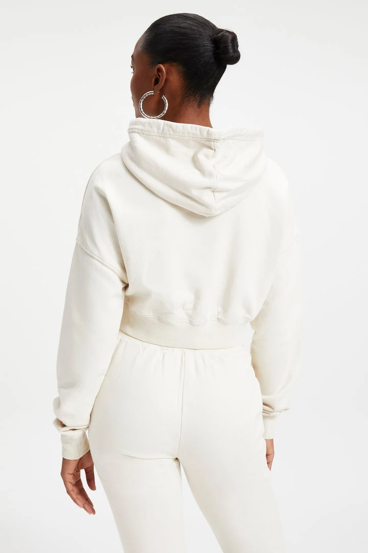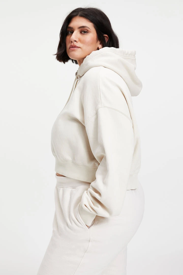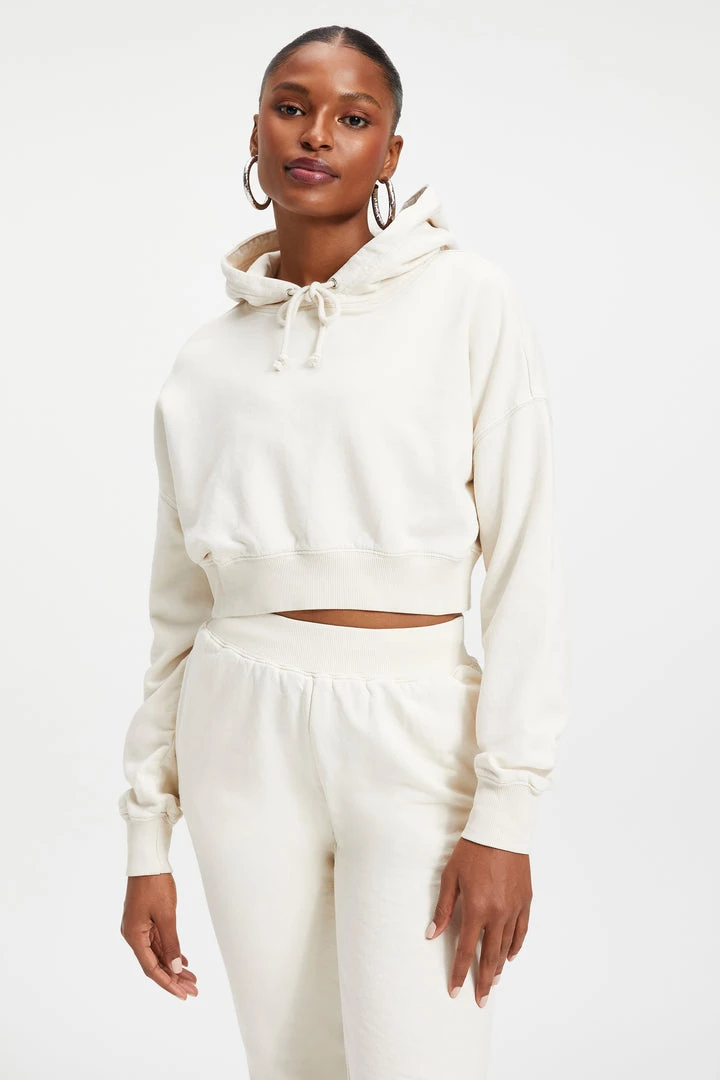Pure comfort, still sexy. Maybe the hoodie that you and Khloé both love most? The Cropped & Cool Hoodie features a wide dropped shoulder, with super long sleeves. Generous knit rib cuff at wrist and waist for snug cozy feel against your skin.